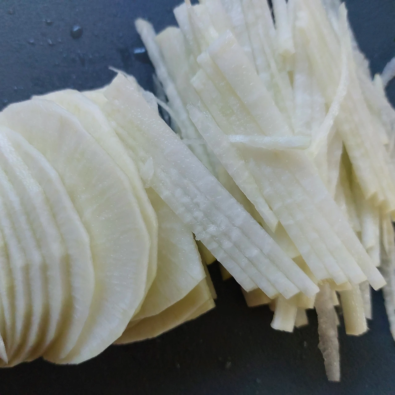 이때 반으로 잘라 쉽게 채 썰 수 있게 하는 게 중요합니다. 아니면 입에서 상스러운 말이 불쑥 튀어나옵니다.
