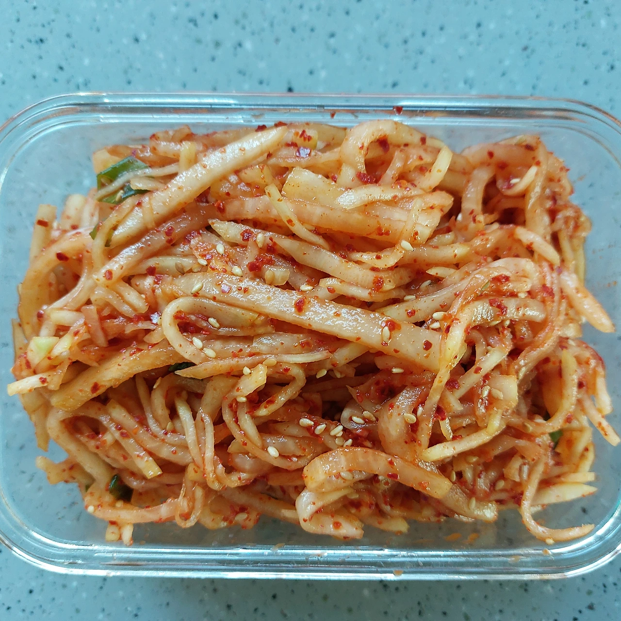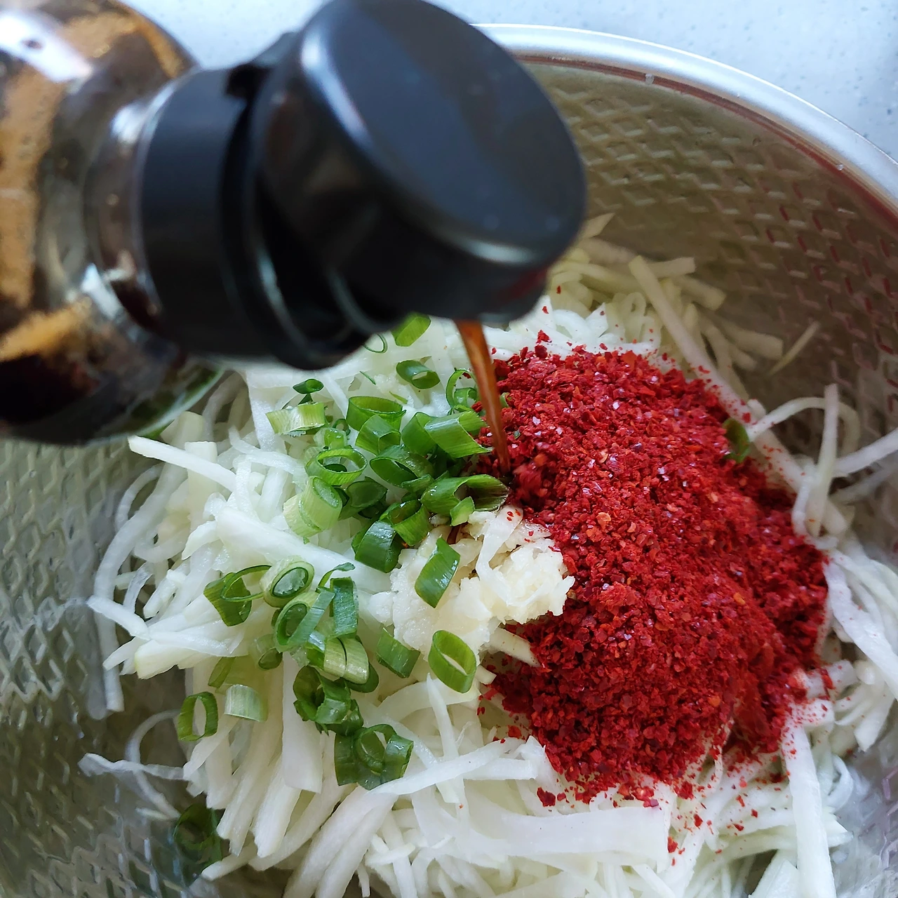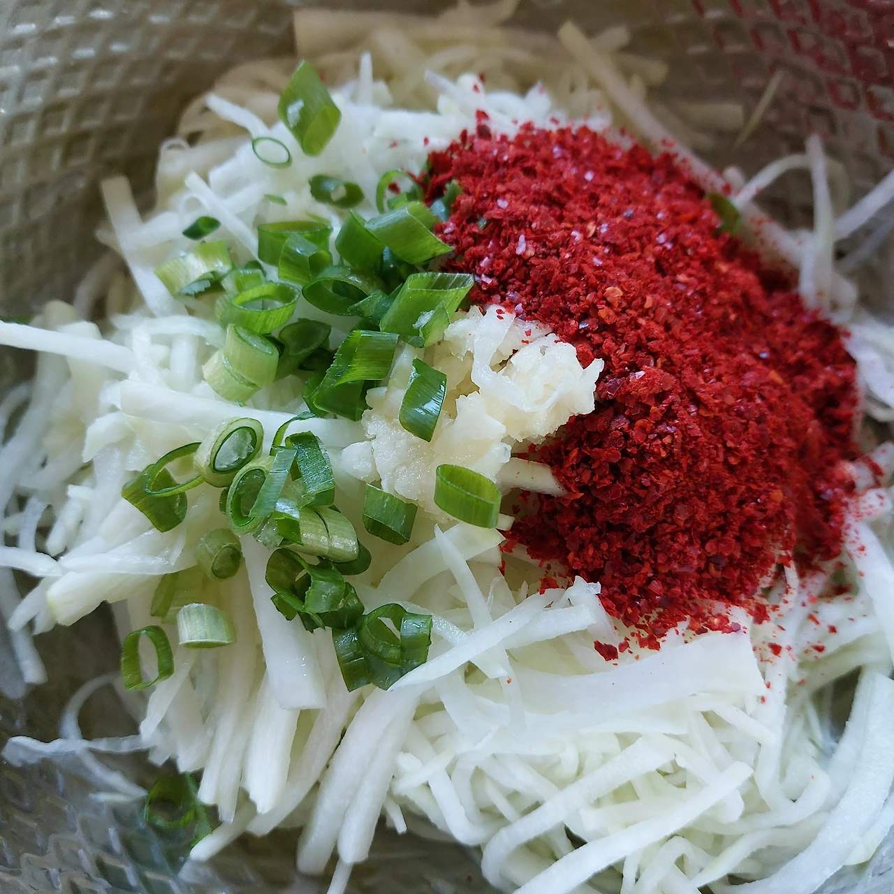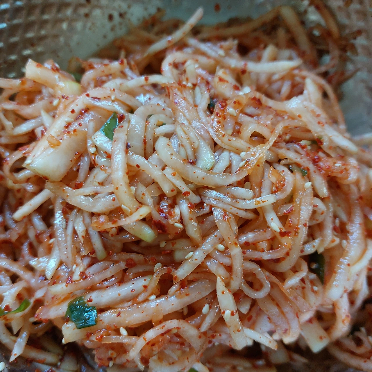 저는 태양초 아니 열풍기에서 말린 고춧가루를 듬뿍 넣어 생기 없는 무의 피부 폰을 왕창 업 시켰습니다.