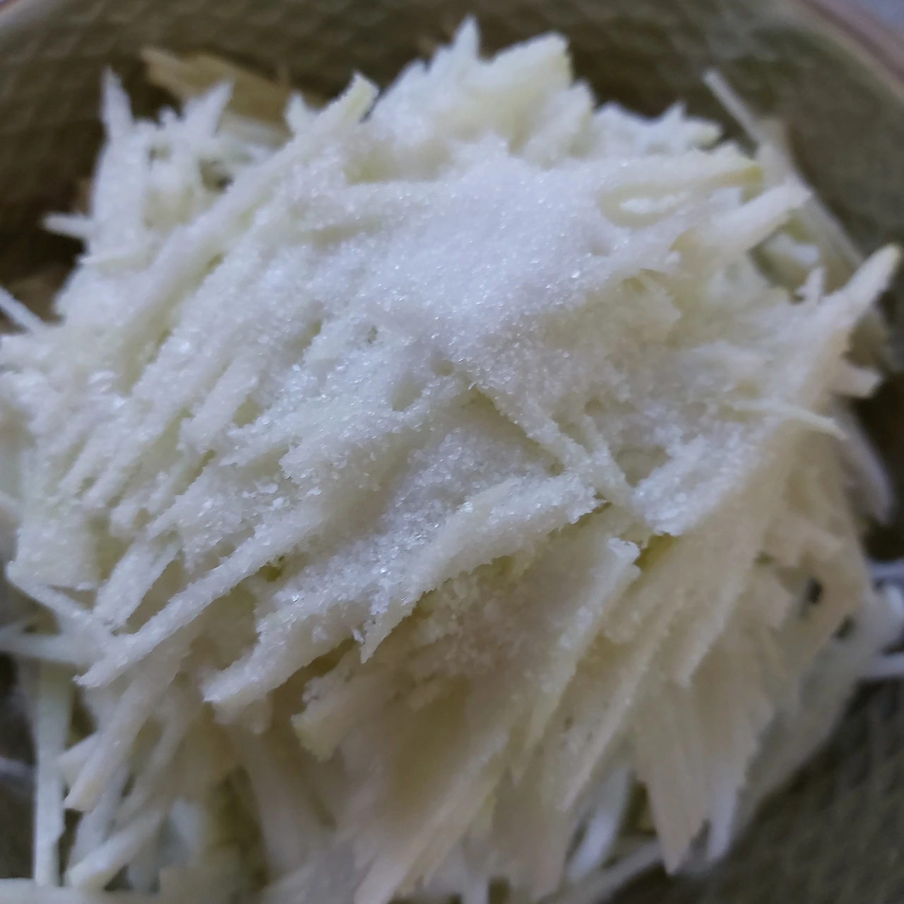무생채에서는 소금과 설탕이 베이스 역할을 합니다. 무가 가지고 있는 많은 수분을 제거해야 음식을 만들어도 물이 생겨 지저분 해질 수 있는 걸 막고, 두고 먹어도 물이 덜 생깁니다.