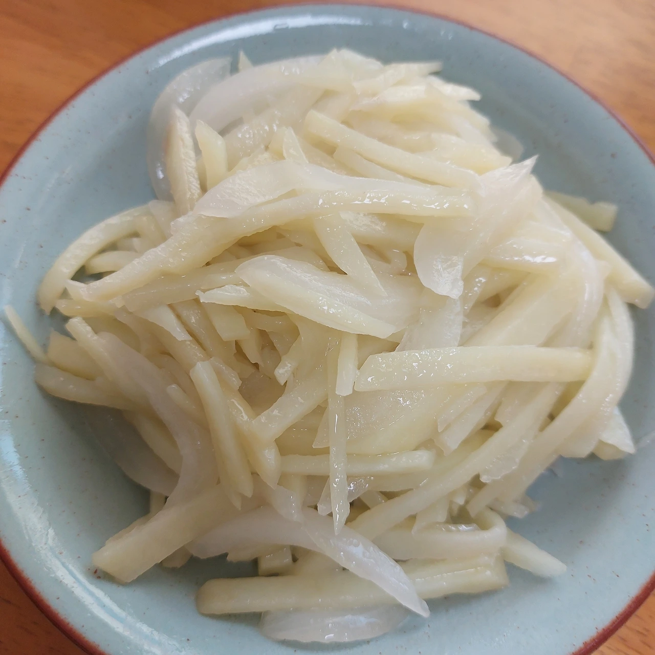 일단 감자는 볶음으로 정했습니다. 얇게 채 썬 감자에 전기 포토에서 끓인 뜨거운 물을 부어 2~3분 담가 두겠습니다. 감자의 전분을 제거해 서로 들러붙는 것도 방지하고 미리 살짝 익혀 오래 볶지 않아도 포슬포슬한 감자볶음이 완성됩니다. 식감도 끝내줍니다.(아무거나 군의 말입니다.)