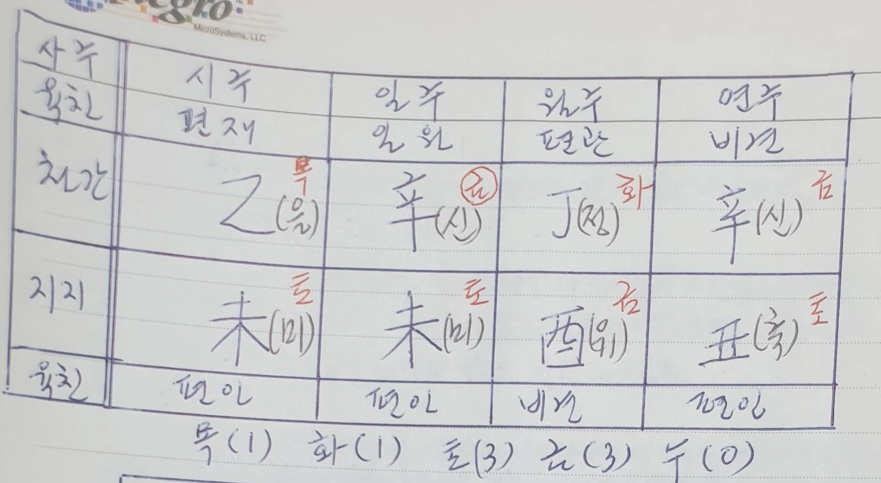 인간의 운명은 태어날 때 이미 정해지는 것일까? 아래 사진은 나의 사주팔자이다. 맨 오른쪽부터 연주 월주 일주 시주다. 즉 신축년 정유월 신미일 을미 시주를 타고났고, 이렇게 네 개의 기둥(주) 이 여덟 글자로 이루어져 사주팔자라 부른다.