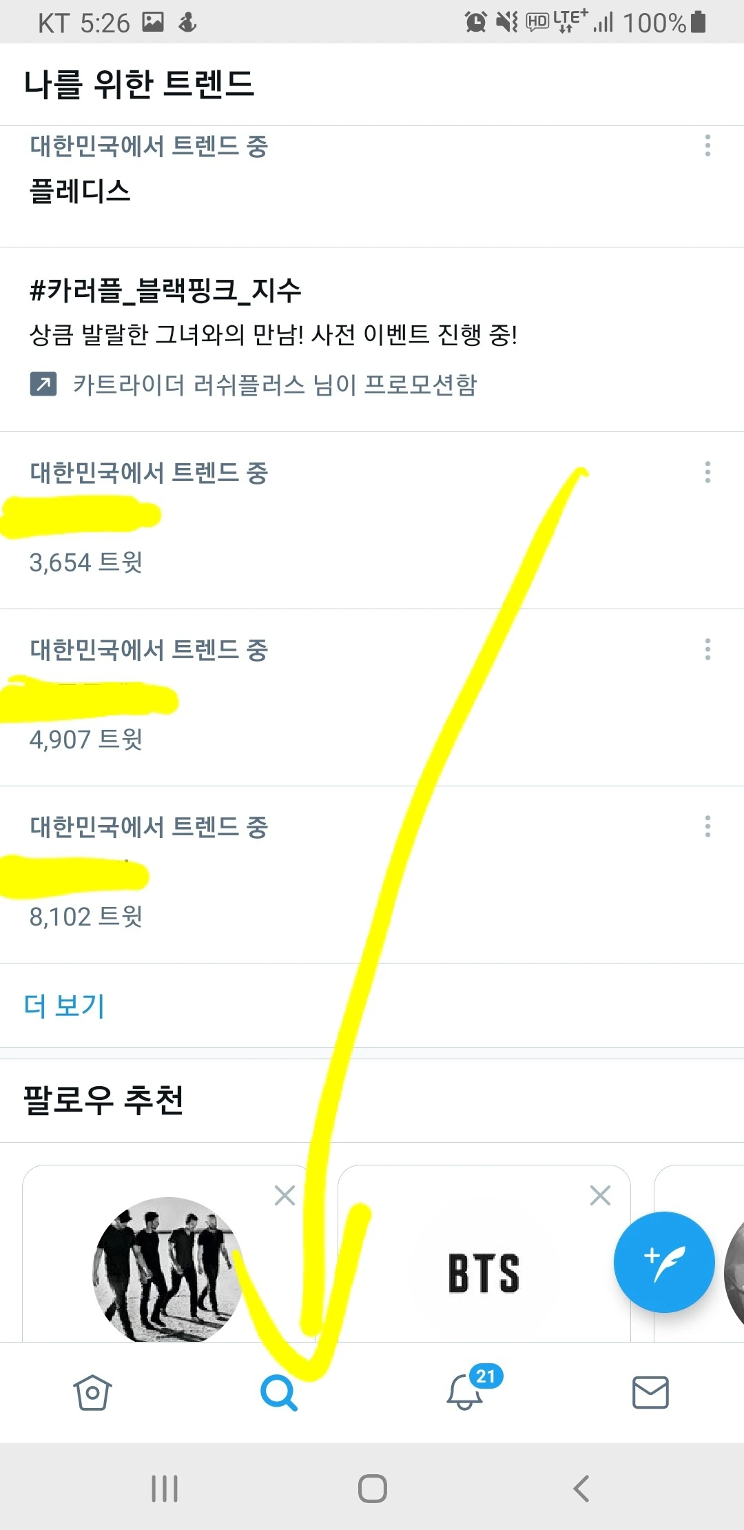 트위터를 보시면 실시간 트렌드, 일명 실트 차트를 보시면 되는데요 , 현재 가장 많이 이야기(트윗) 되는 키워드를 보여주는 차트입니다.