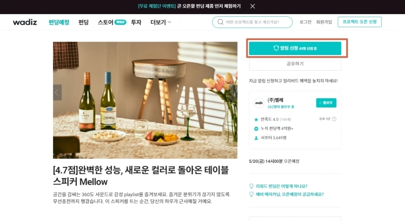 와디즈는 아래 이미지와 같이 펀딩예정 신청이
