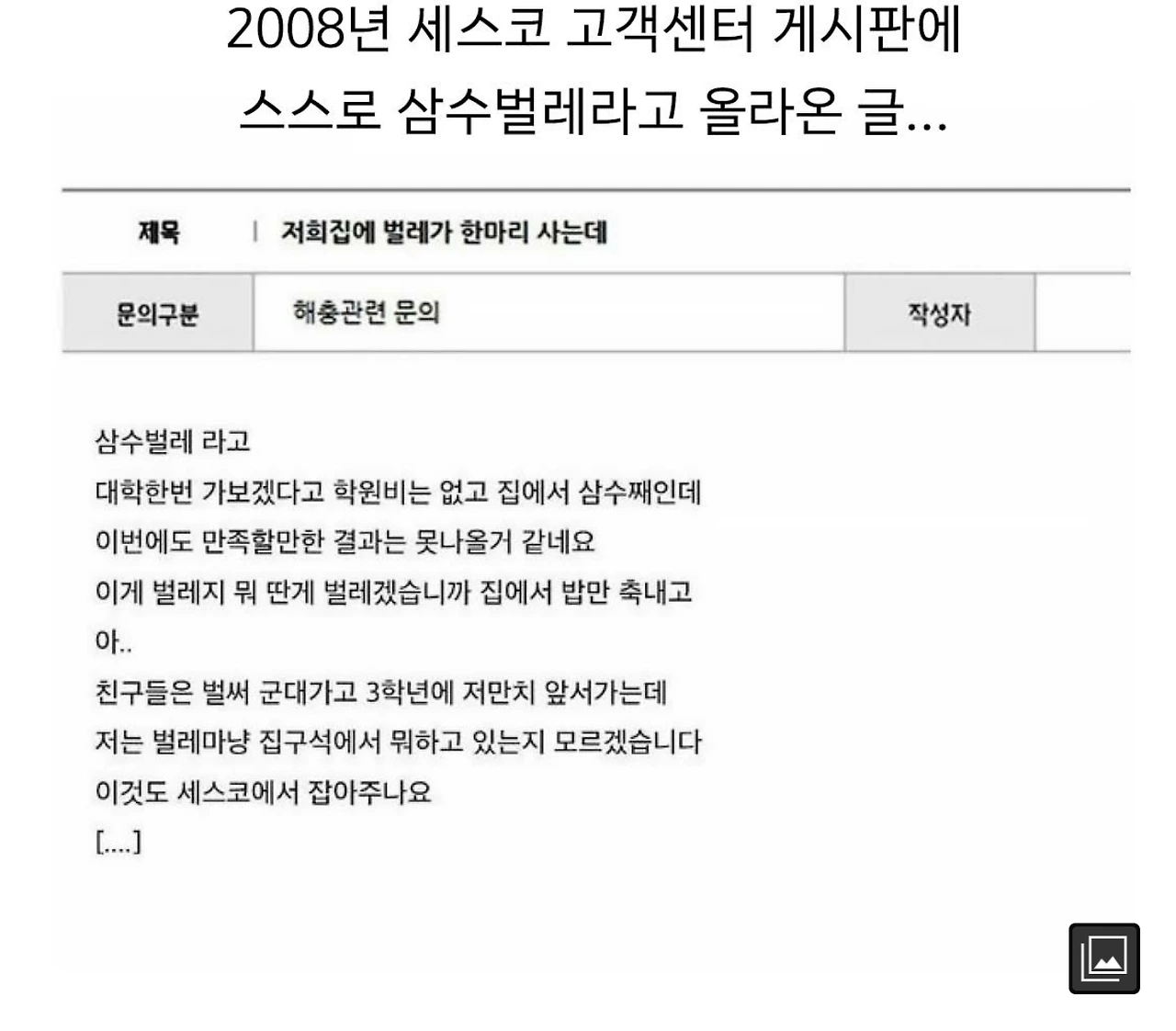 인터넷 커뮤니티에 유명한 세스코 삼수벌레글이다.