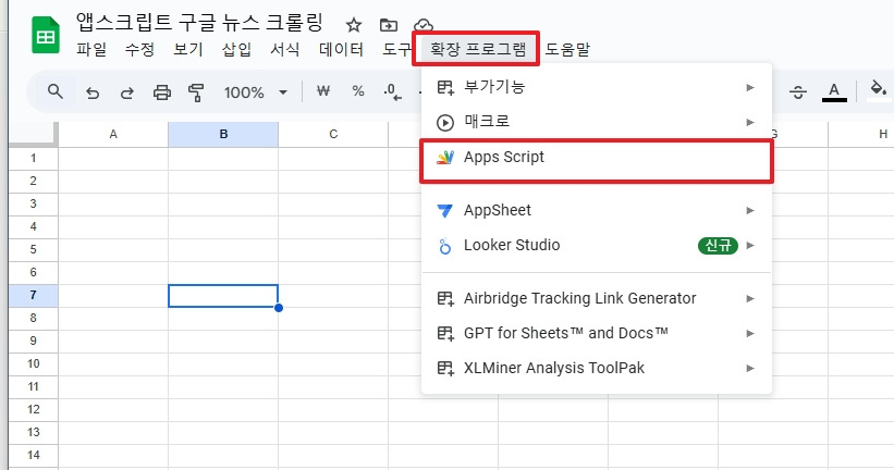 스프레드시트 상단 메뉴에서 확장 프로그램 스크립트 편집기를 클릭해 앱스크립트 편집기를 엽니다