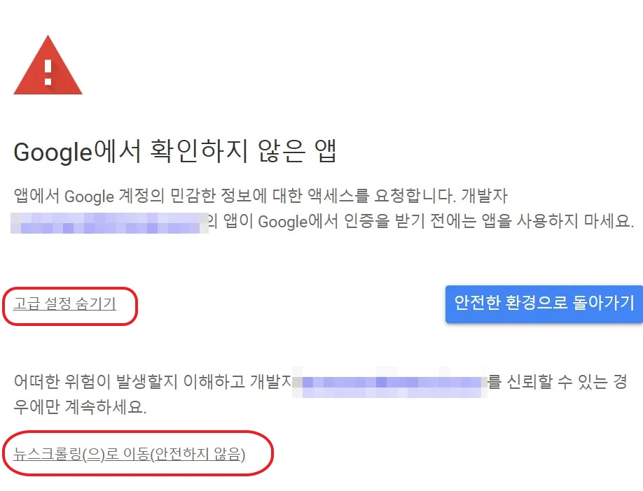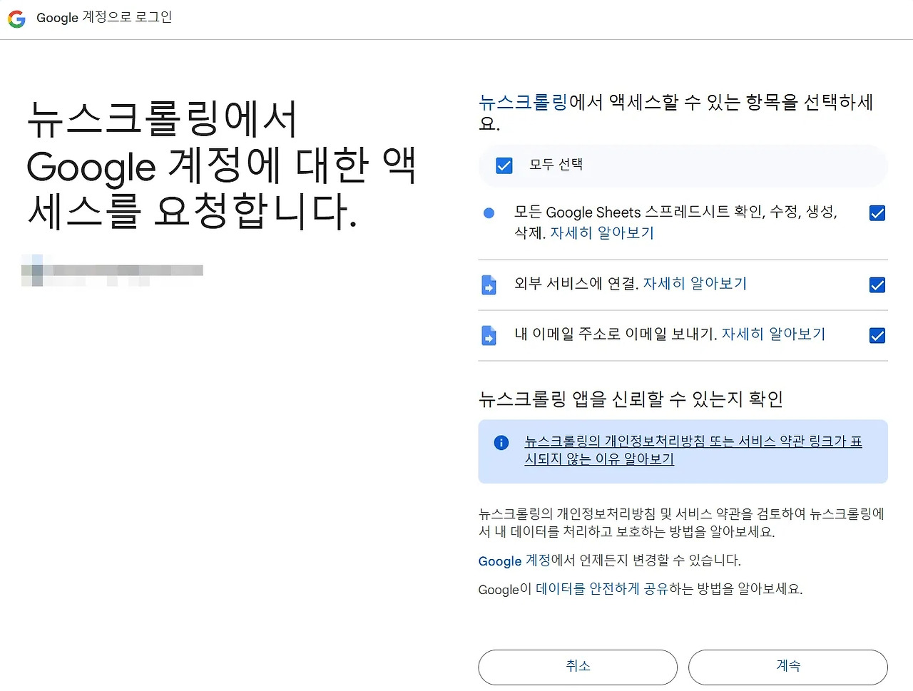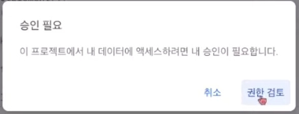 이제 앱스립트 코드를 작성 후 실행을 하게 되면 아래와 같이 구글에서 확인하지 않은 앱 이라고 떠요! 액세스 알럿이 뜨는데 이때 고급설정 숨기기 -> 내가 설정한 '앱스크립' 명에 제목 예)뉴스크롤링(으)로 이동 하시고 나서 -> '앱스크립트' 명의 액세스 요청을 허용하시고 오른쪽 이미지와 같이 승인 해주시고 계속 헤주시면 완료!