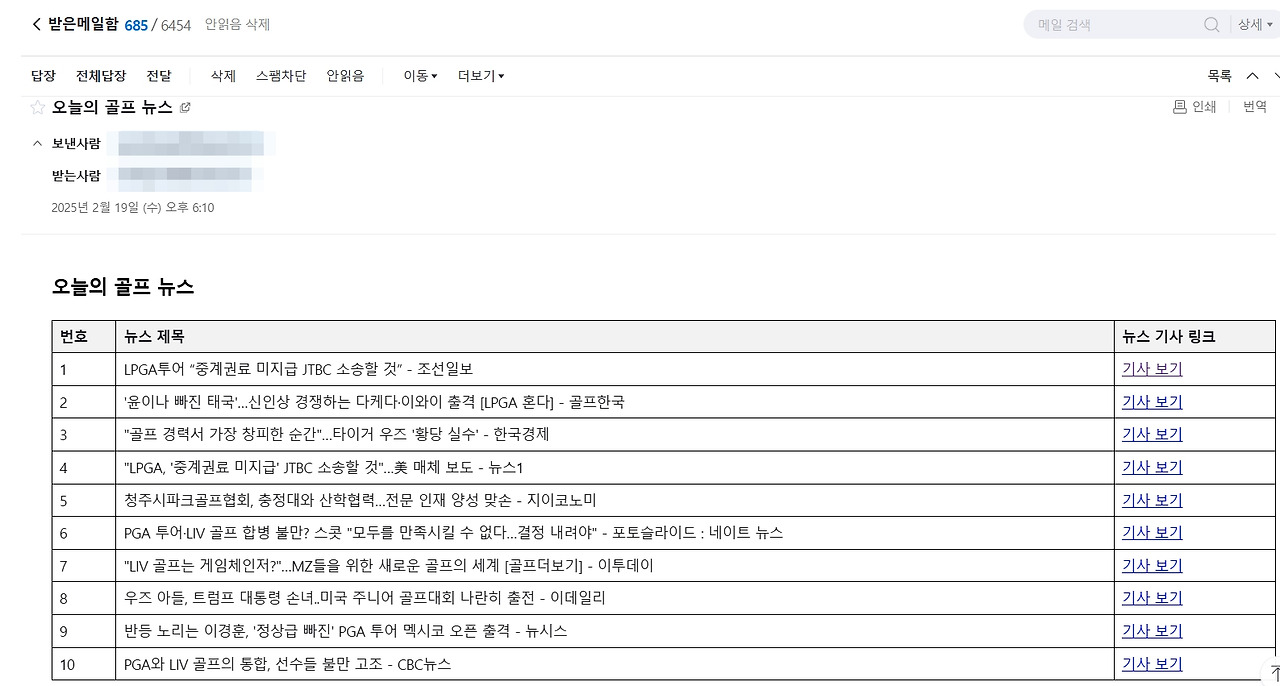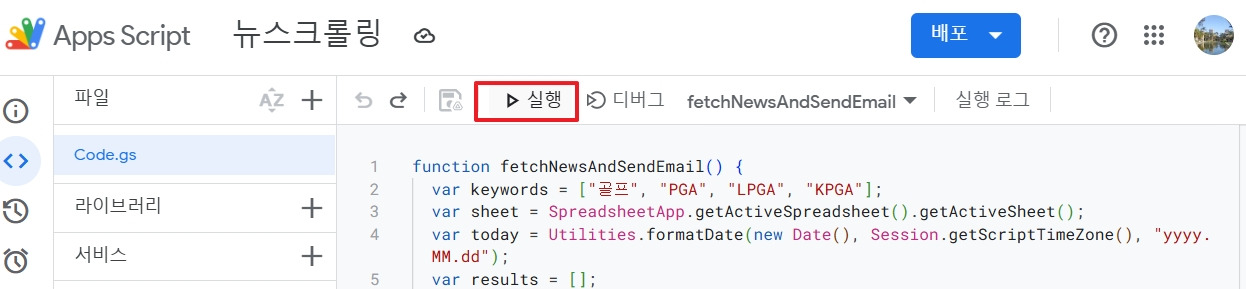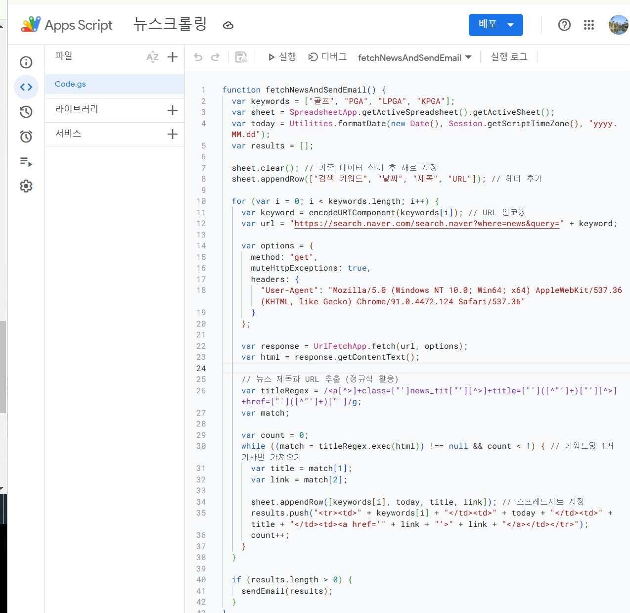 <실제 앱스크립트 코드로 작업한 자동화 골프 뉴스>
