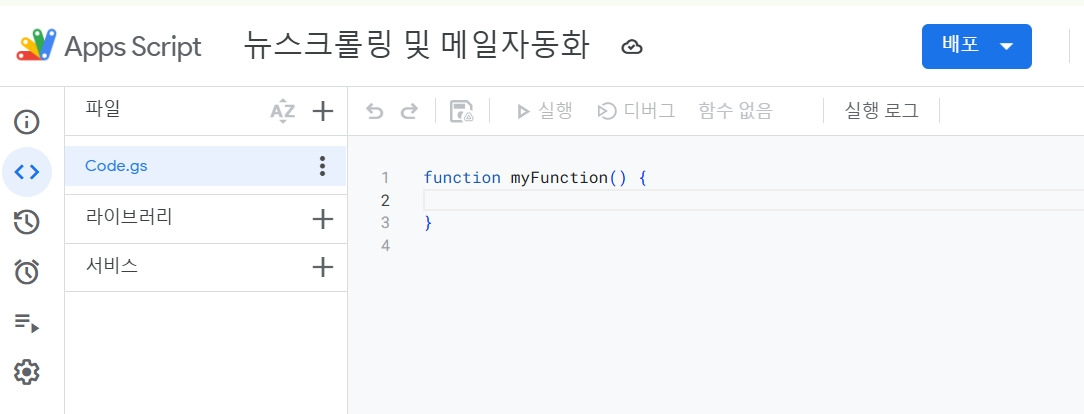 아래는 제가 앱스크립트 코드를 code.gs 에 넣어둔 모습입니다.