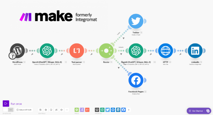 시각적으로 워크플로우를 그릴 수 있는 자동화 플랫폼입니다. 이메일, 구글 시트, 슬랙, 메일침프, 페이스북 광고 등 다양한 툴과 연동할 수 있으며, 조건 분기, 시간 지연, 필터링 등도 설정이 가능합니다.