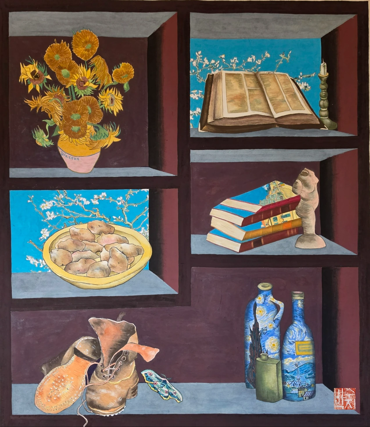 저는 전통 민화의 책가도(冊架圖) 형식을 빌려, 고흐가 평생을 바쳐 좇았던 거룩한 삶의 궤적을 담아보았습니다.