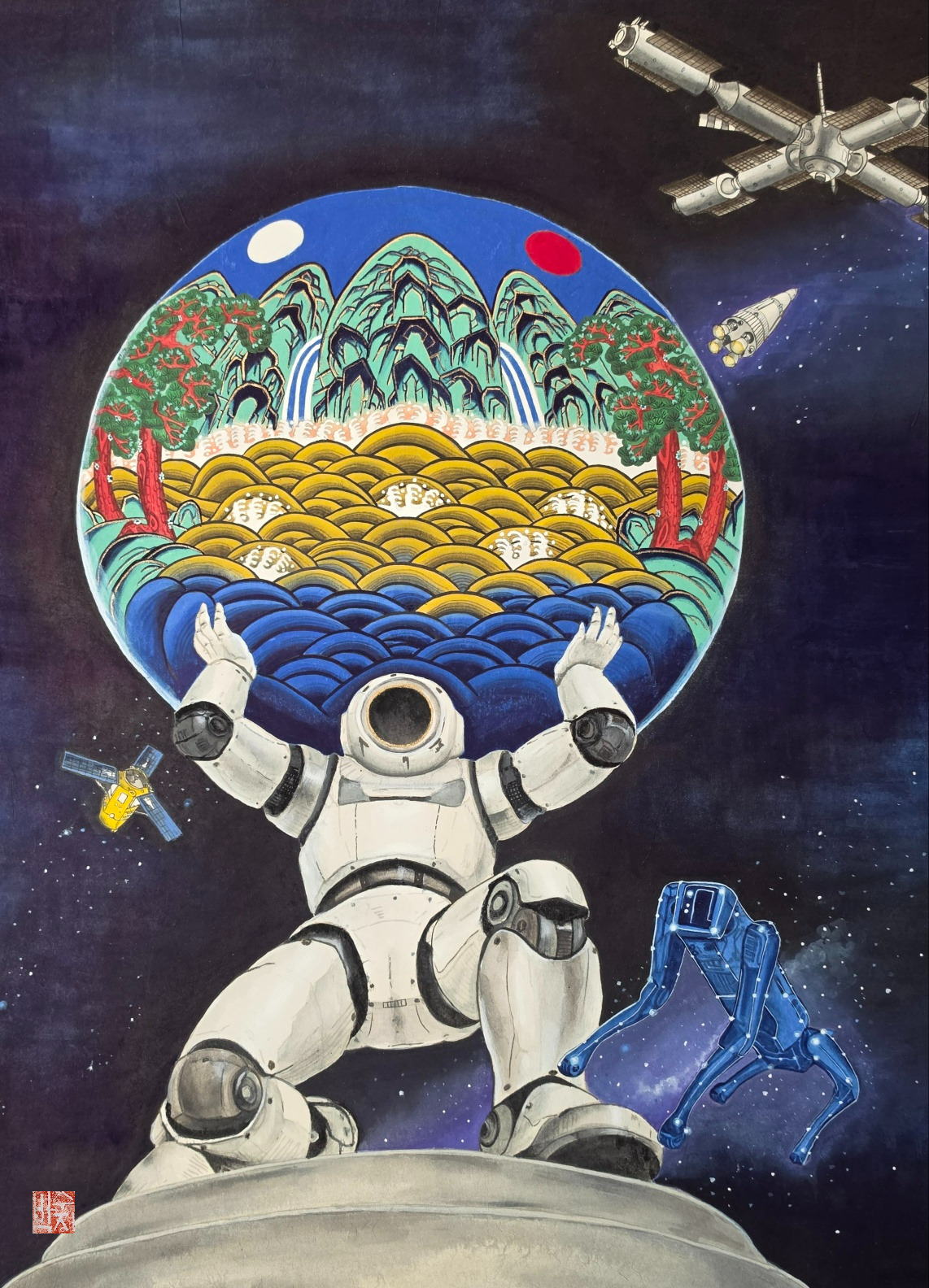 그리고 오른편 아래에는 별자리처럼 빛나는 파란 로봇 개가 있습니다. 보스턴 다이내믹스의 스팟을 닮은 그 로봇은 반짝이는 별들로 이루어진 몸을 가지고 있습니다. 기계와 우주, 기술과 자연이 뒤섞인 존재. 인류의 찬란한 성취들입니다.