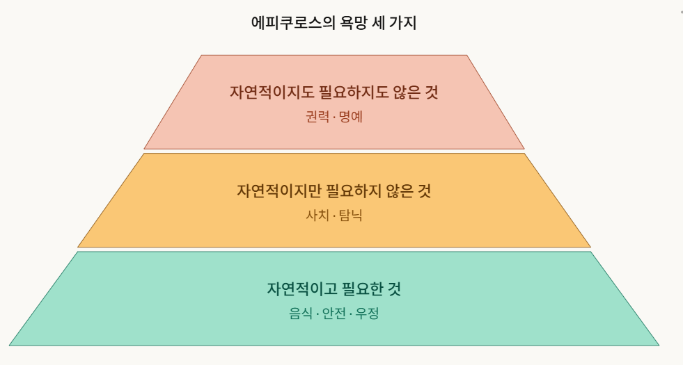 첫째, 자연적이고 필요한 것 — 음식, 안전, 우정. 둘째, 자연적이지만 필요하지 않은 것 — 사치와 탐닉. 셋째, 자연적이지도 필요하지도 않은 것 — 권력과 명예.