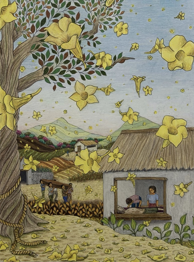 * 그들은 호세 아르까디오 부엔디아의 방으로 가서 그를 온 힘을 다해 흔들어보고 귀에 대고 소리를 지르고, 콧구멍 앞에 거울을 갖다 댔지만, 그를 깨울 수가 없었다. 잠시 후 목수가 관을 만들기 위해 그의 몸 치수를 재고 있을 때, 그들은 창밖으로 작은 노란 꽃이 보슬비처럼 떨어지는 것을 보았다. 그 꽃비는 조용한 폭풍우처럼 밤새도록 내려 지붕들을 덮고 문들을 막아 버렸으며 밖에서 잠을 자던 짐승들을 질식시켜버렸다. 너무나 많은 꽃이 하늘에서 쏟아졌기 때문에 아침이 되자 거리가 폭신폭신한 요를 깔아 놓은 것처럼 되어버려서 장례 행렬이 지나갈 수 있도록 삽과 갈퀴로 치워야 했다.