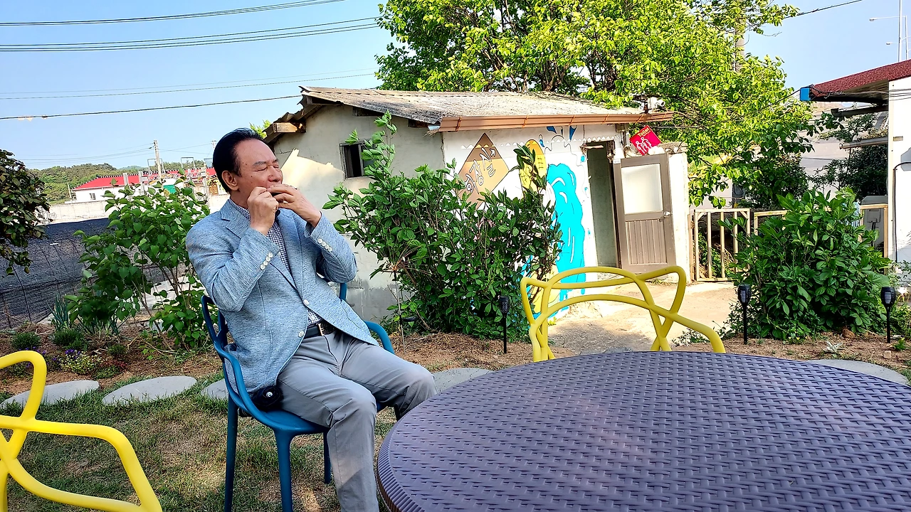 거기에 앉았다 잠시 기다리는 시간에 하모니카를 연주하는 회원이 있다. 꿍짝꿍짝 박자를 넣어가며 연주한다.