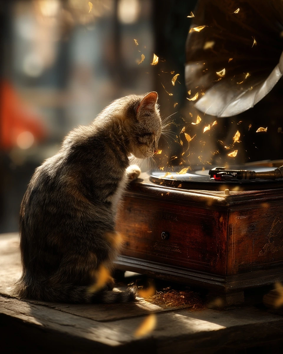그 순간, 구석에 있던 고양이가 축음기로 뛰어올랐다. 앞발로 바늘을 툭 치자, 기묘한 삑— 소리가 났다. 나는 깜짝 놀라며 입을 막았고, 지훈은 황급히 고양이를 안아 내렸다.