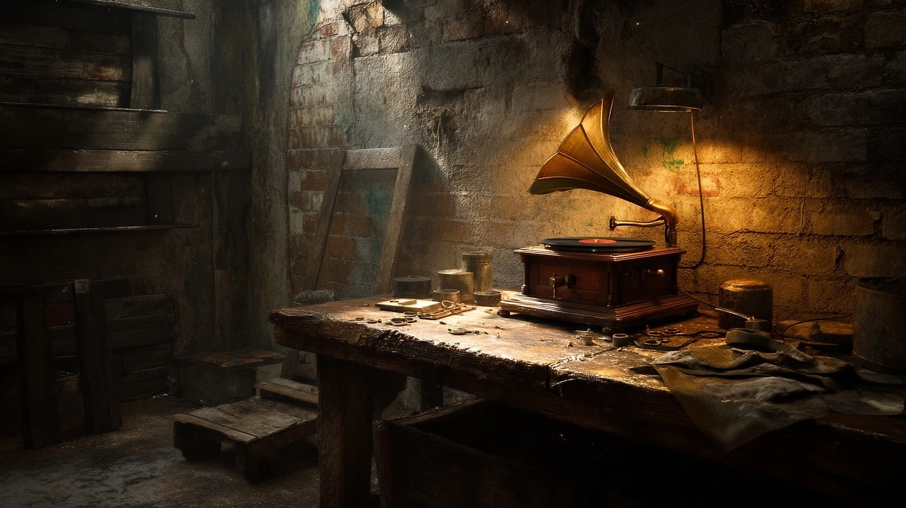 그는 낡은 축음기를 무릎 위에 올려두고 바늘을 조율하고 있었다. 작은 드라이버가 그의 손에서 반짝였다. 옆에는 흩어진 나사와 기름 묻은 천 조각들이 널려 있었다.