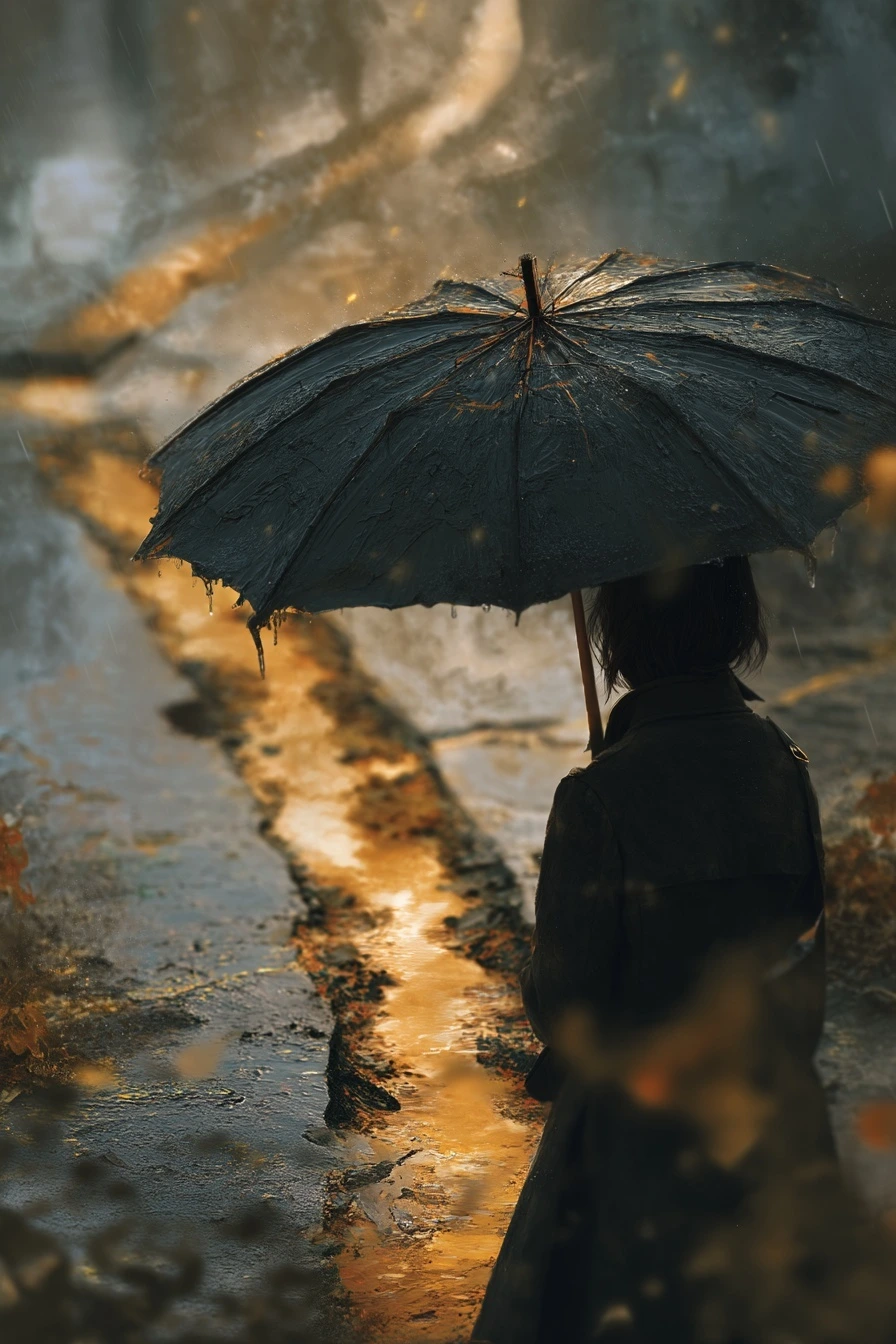 그리고 그때, 화면이 주머니 속에서 다시 한 번 오래 떨렸다. 이번에는 진동이 아니라, 길게 울리는 호출음이었다. 내 손이 본능적으로 주머니 안으로 들어갔다. 차가운 유리와 손끝이 만나려는 순간, 우산의 살이 조금 더 뒤틀리며 시야의 한쪽을 비워 주었다. 길 위, 물고인 작은 웅덩이에 현관 불빛이 흔들렸다. 불빛은 금빛 선처럼 수면 위를 길게 그었다. 나는 입술을 다물었다. 대답이 늦어지는 시간만큼, 소리는 내 쪽으로 더 가까워질 것 같았다.