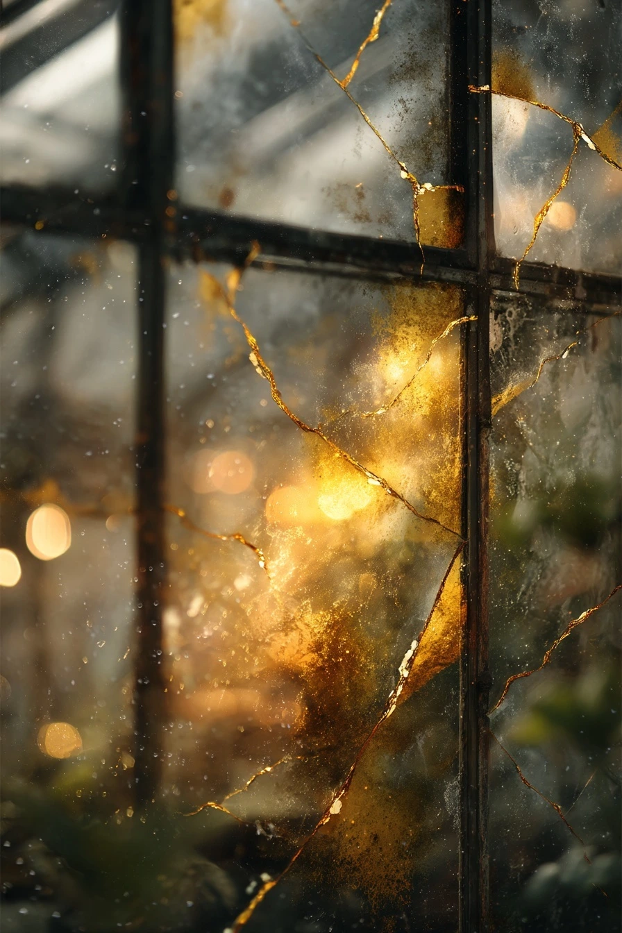 우리는 함께 온실로 향했다. 지하 창고의 축축한 어둠과 달리, 온실은 맑은 빛으로 가득했다. 그러나 그 빛조차 균열을 감추지 못했다. 유리창에는 금박으로 이어 붙인 흔적이 상처의 연대기처럼 남아 있었다.