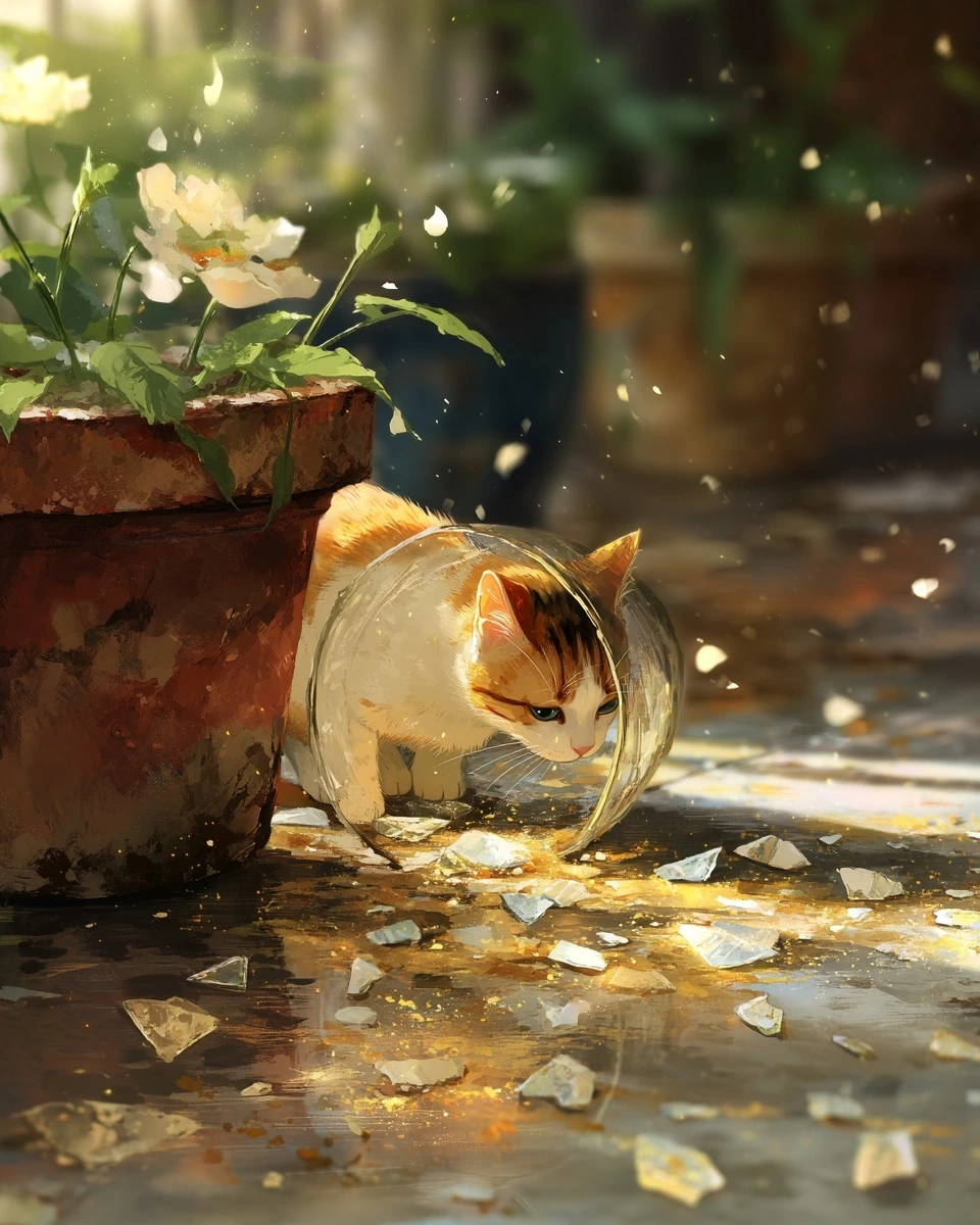 그러나 고양이는 곧 내 팔에서 뛰쳐나가더니 유리 화분을 발로 쳤다. 쾅—!