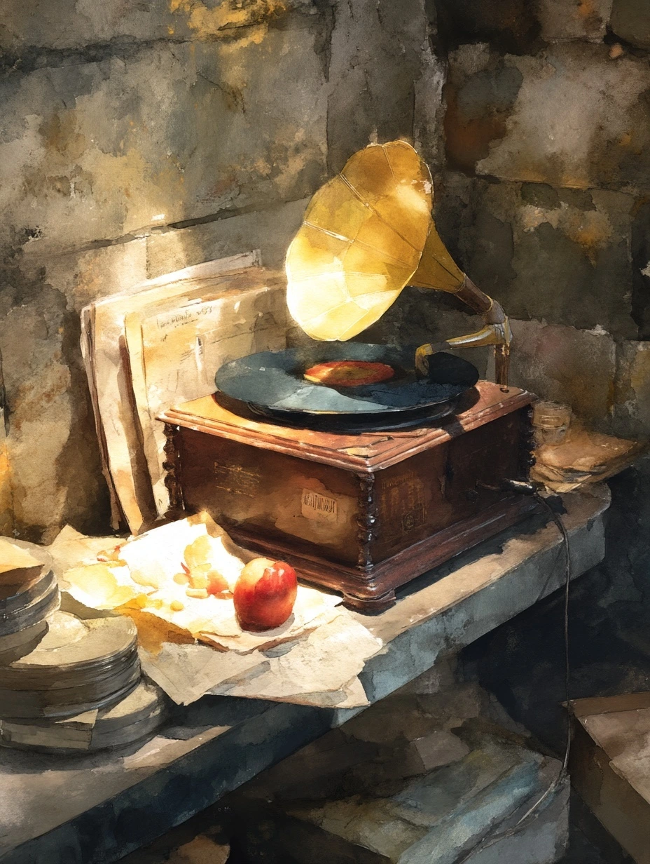 지하실은 누군가 방금 나간 방처럼 어수선했다. 축음기 옆엔 여분의 바늘, 벽엔 기울어진 레코드 자켓, 탁자 위엔 유리잔 두 개와 반쯤 먹다 만 사과. “귀신의 취향치고 사과는 너무 현실적이죠.” 지훈의 농담이 긴장을 풀었다.