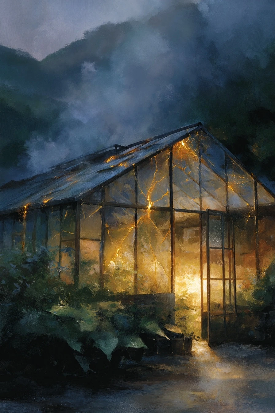 머릿속에서 온실 유리의 봉합선이 순식간에 꺼졌다 켜졌다. 빛의 길이 끊기고, 식물들이 방향을 잃고, 축음기 소리가 튀는 상상이 짧고 날카롭게 스쳐갔다.