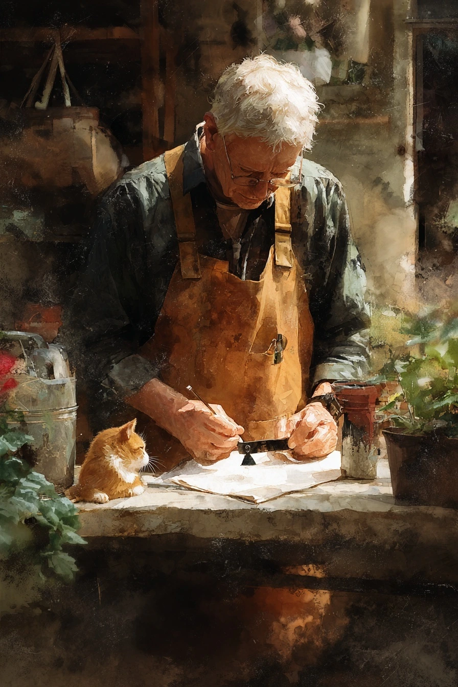 관리인은 새 페이지를 펴며 오늘 날짜를 적었다. ‘오전 7:12. 비 소강. 금박의 맥박 안정.’ 고양이는 장부 모서리에 얼굴을 비비고는 의기양양한 얼굴로 온실 한 바퀴를 돌았다. 그 자세가 마치 오늘의 감독관 같았다.