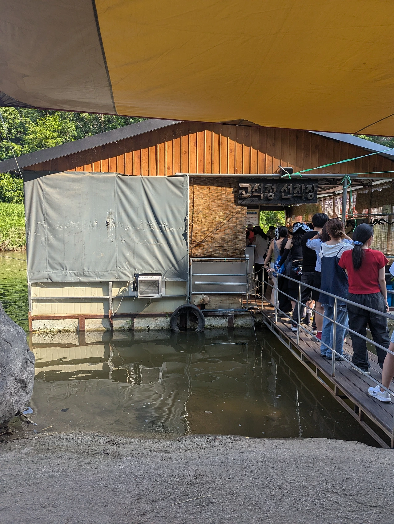 초불소 타임에 띿놀이하는 사람들을 제쳐두고 우리는 뱃놄이를 했다. 좀 더웠기 때문에 이런 액티비티를 하는 수밖에 없었다. 얼음물을 사서 선풍기 앞을 배회했다. 대충 여섯 차례, 이십분 정도? 기다리고서 배를 탈 수 있었다. 상류쪽으로는 래프팅하는 사람들이 있었고 임꺽정이 숨어지냈다고 하는 엄청 커다란 바위를 지나 하류께 내려갔다가 올라왔다. 모래톱 있는 계곡 쪽으로 사람들이 물에 몸을 담그고 피서를 즐기고 있었다. 나는 반지를 반대쪽 손으로 끼고 모터보트의 속력을 즐기기 위해 왼손을 기울여 물에 집어넣었다. 개활지에서 흘린 땀이 좀 식혀지는 느낌을 받았다.