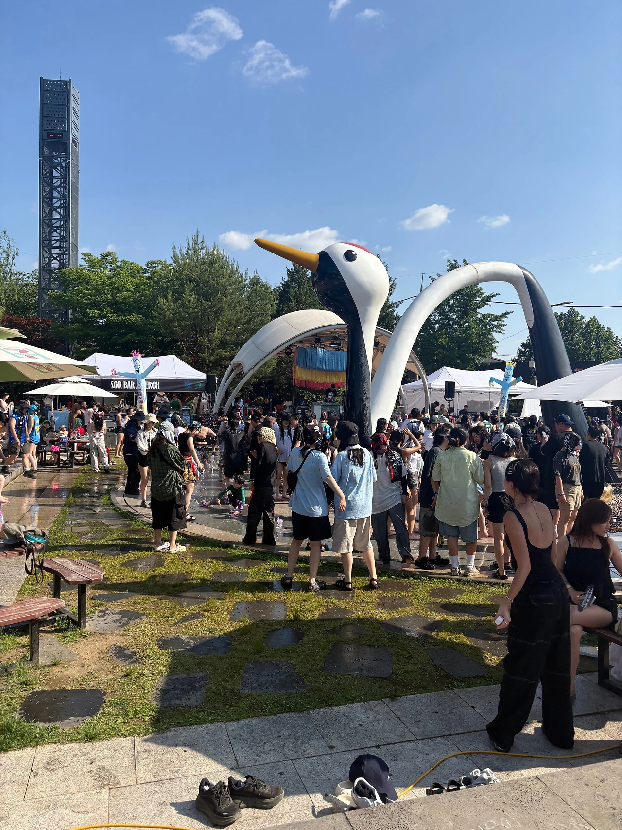 가기 전 주에 둘러 앉아서 한 시간 짜리 영상을 봤다. 두루미 조형물 아래 분수대에서 EDM 축제가 열리고 있었다. 더위를 식히려고 헐벗은 채로 물을 맞는 사람들이 계속해서 두루미 주변을 빙글빙글. 애인은 그걸 보고 저렇게 놀 수 있음에 질려했고 난 약간 어색하게나마 끼어 보고 싶다는 생각을 했다. 격의 없이 저렇게 놀 수 있는 것이 이 페스티벌의 속성을 잘 보여준다는 생각도 들었다.