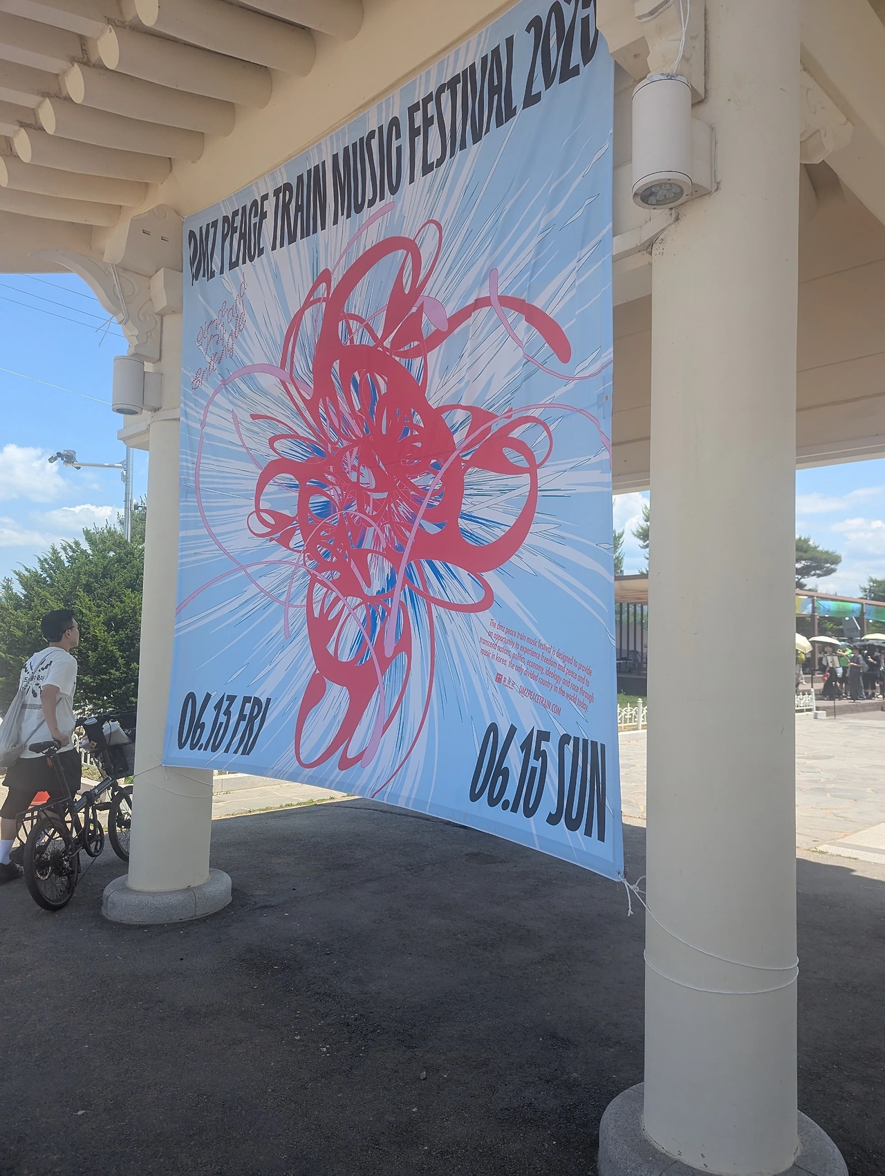 꽃 축제장에 차 대고 걸어오니 10분이 조금 안 되는 시간이 걸렸다. 티켓은 매진이 안 됐는지 현장에서 판매하는 수량도 조금 있었고, 티켓 수령줄 즈음부터 깃발 든 사람이 보여 페스티벌 느낌이 났다. 그리고 (라인업이 아주 좋은) 펜타포트만큼은 아니겠지만 그거 온 것만으로도 이미 많이 더웠다...