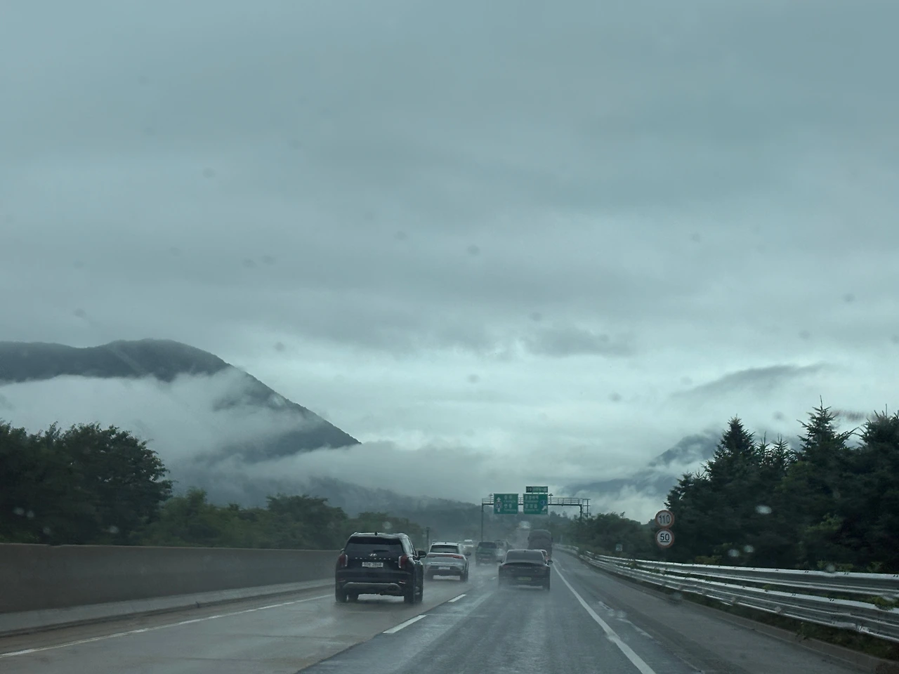 철원에 1시 전에는 도착해야 했으므로 조금 일찍 나섰다. 문경 지날 즈음에는 비가 내리고 있었는데, 산에 온통 안개가 껴서 풍경이 아주 예뻤다. 한편으로는 내리는 비가 철원에까지 닿아 있는 게 아닐까 싶어 다소 걱정도 되었다. 여행에 휴게소 음식이 빠질 수 없으므로 지칠 때쯤 한 번 내려가서 핫바도 하나 사 먹었다. 철원에 다 도착하니 신호등이 빼곡한 길이 우릴 맞이했다. 계속 신호에 걸리다보니 늦는 거 아닌가? 생각도 들었지마는 네비게이션 도착 시간이란 것은 대개 그러한 요소도 고려하여 설정되는 것이라 도착예정시간과 동일한 시각에 주차를 했다. 입장시간보다 늦은 것은 아니었지만 그렇다고 아주 일찍 오진 못했으므로 고석정 옆의 주차자리는 가지 못하고, 바로 옆 꽃축제장 주차장을 이용했다. 우린 돗자리와 짐들을 챙기고 차를 떠났다. 비 예보가 있었으므로 더위를 대비해 차 창문을 살짝 열어두는 행위는 하지 않았다.