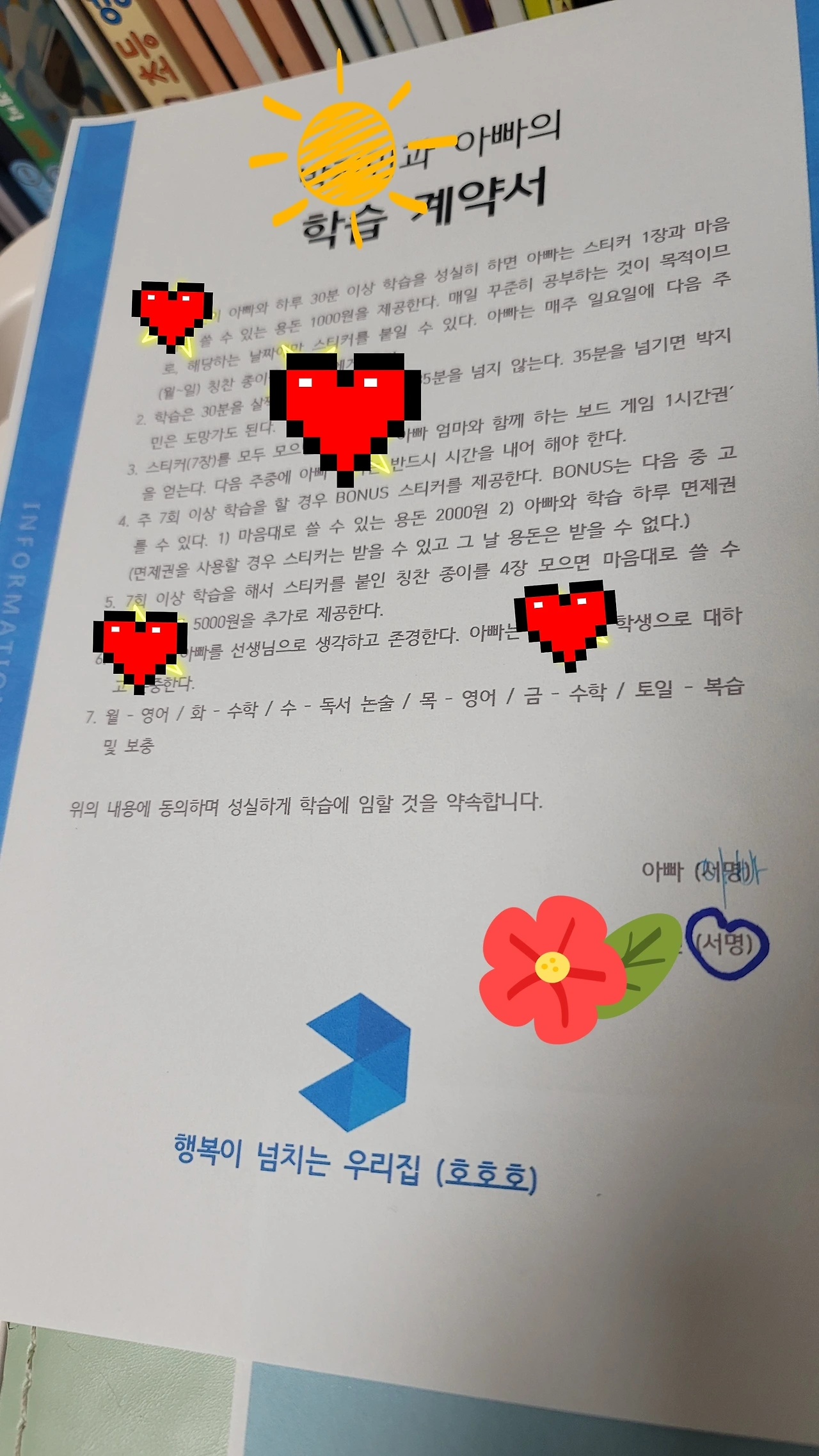 3. 스티커(7장)를 모두 모으면 박○○은 ‘아빠 엄마와 함께 하는 보드 게임 1시간권’을 얻는다. 다음 주중에 아빠 엄마는 반드시 시간을 내어 해야 한다.