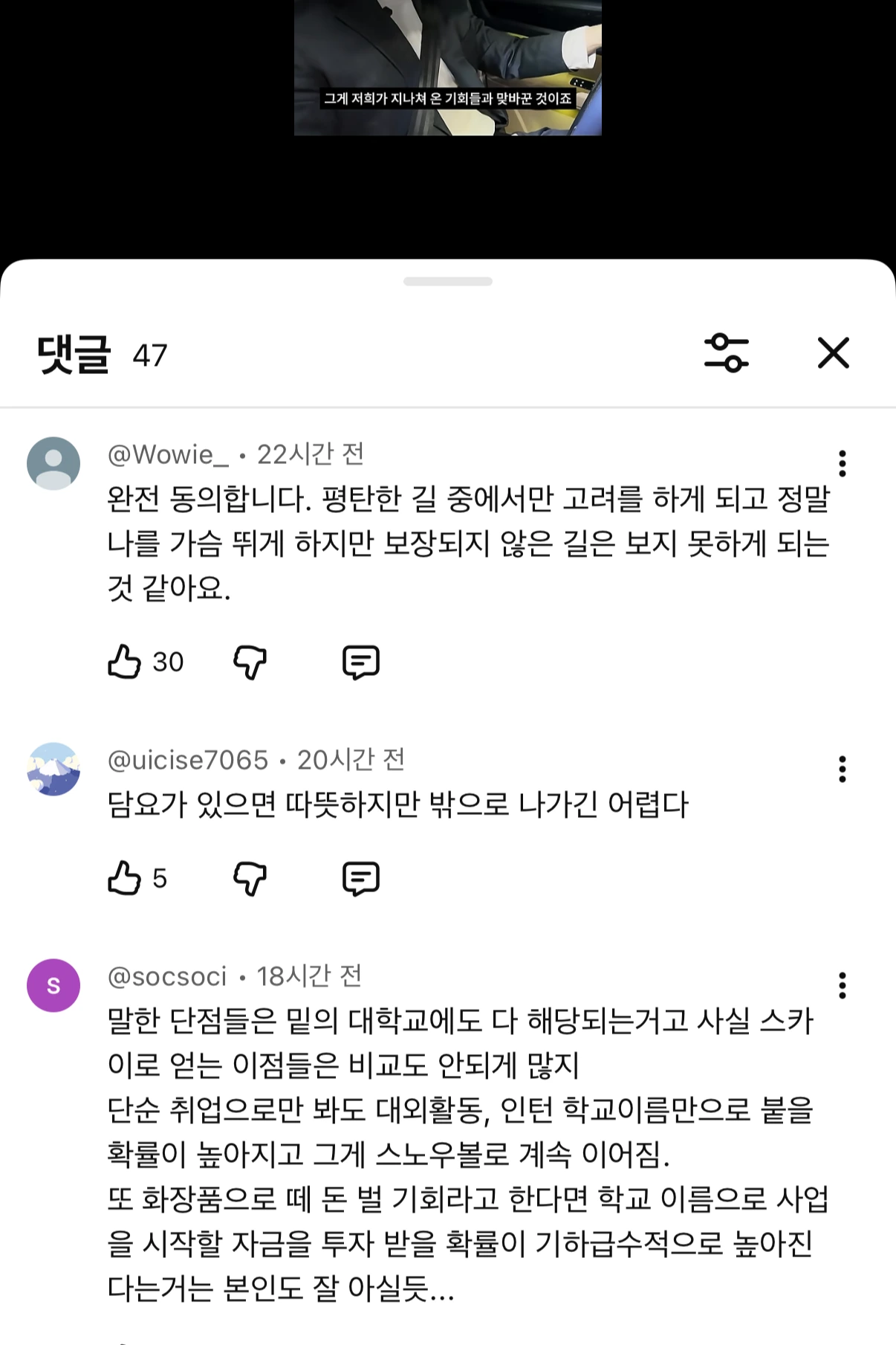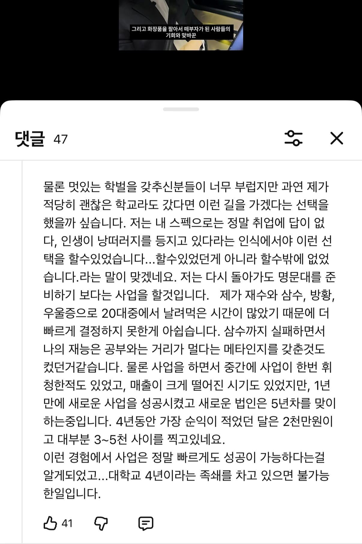 그리고 오히려 좋은 대학을 나오면 눈만 높아져서 쉬이 새로운 도전을 하기가 힘들어진다.