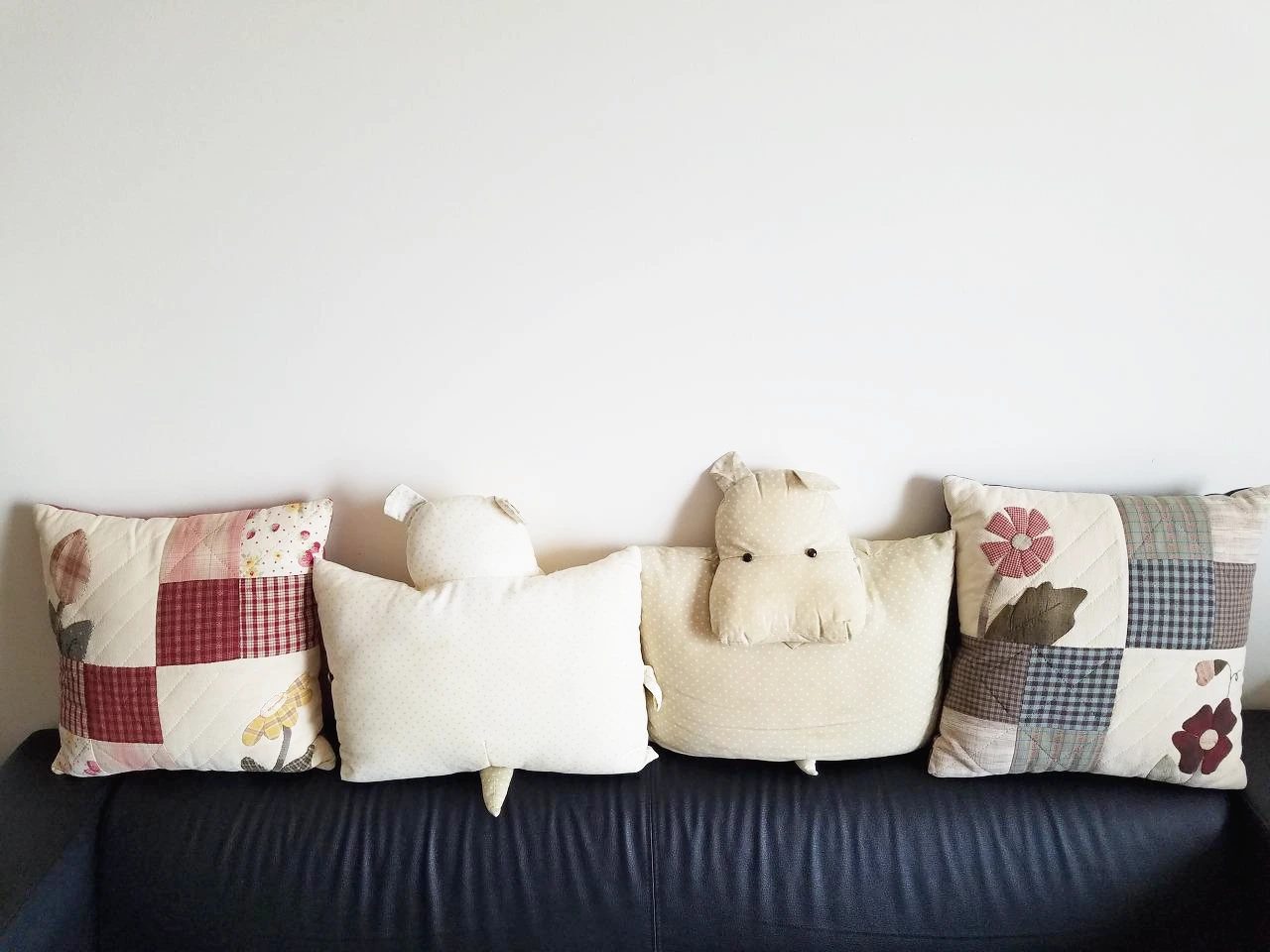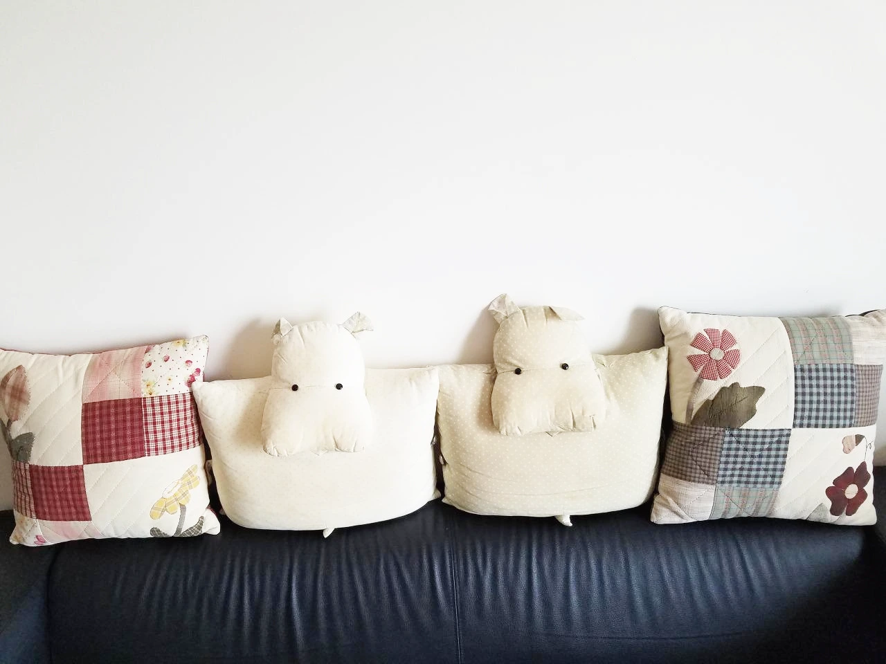 엄마가 만들어주신 퀼트 쿠션들과 깨둥 & 깨송 하마 형제 인형들.