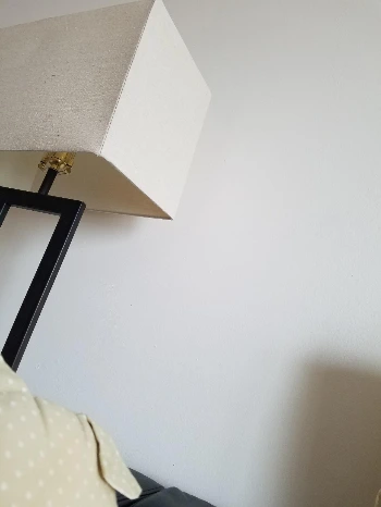 소파 옆 엔드 테이블 위의 베이지 전등의