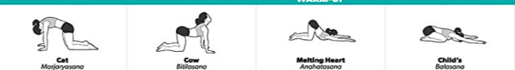 왼쪽부터 고양이 자세, 소 자세, 멜팅 하트 자세, 그리고 아기 자세