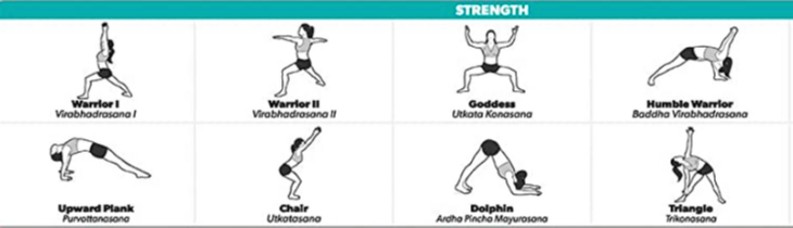 첫 번째 줄 왼쪽 끝부터 워리어 자세 I과 II, 그리고 두 번째 줄 오른쪽 끝 트라이앵글 자세를 하고 있다.
