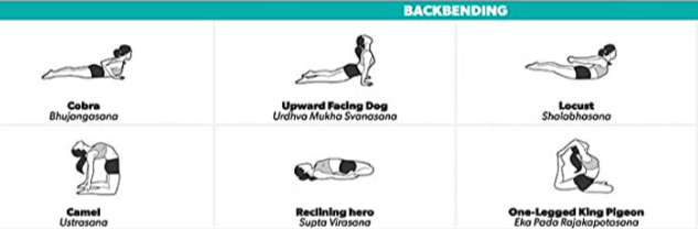 첫 번째 줄 왼쪽 코브라 자세와 업워드 페이싱 도그 자세, 그리고 두 번째 줄 왼쪽 낙타 자세를 하고 있다.