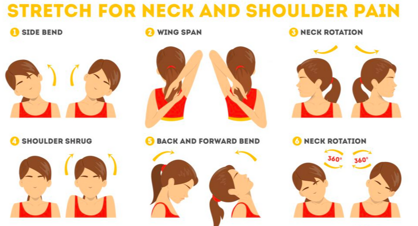 목을 좌우 아래위로 각각 5초씩 부드럽게 유지해주며 근육이 늘어나는 것을 느낀다. 어깨 움츠리기와 목 돌리기로 마무리한다. 출처: www.betterpt.com
