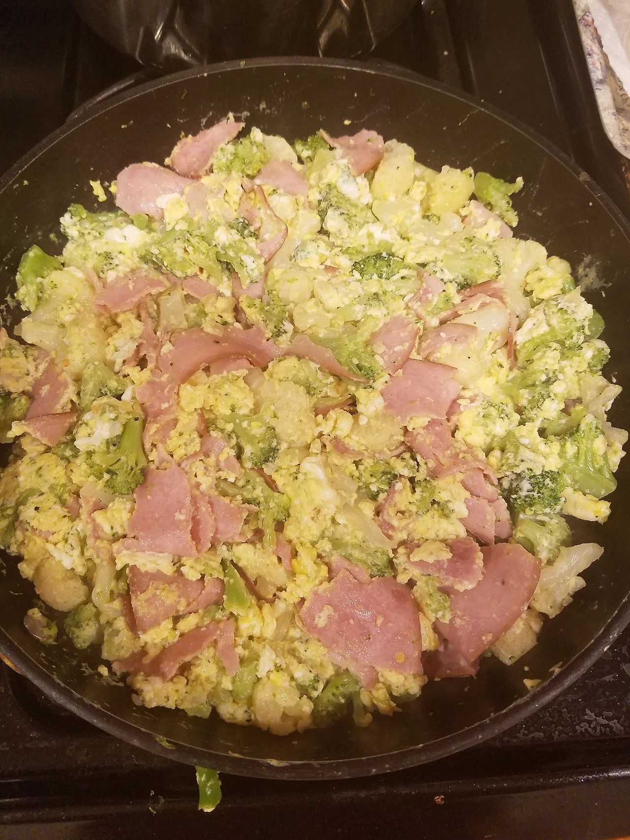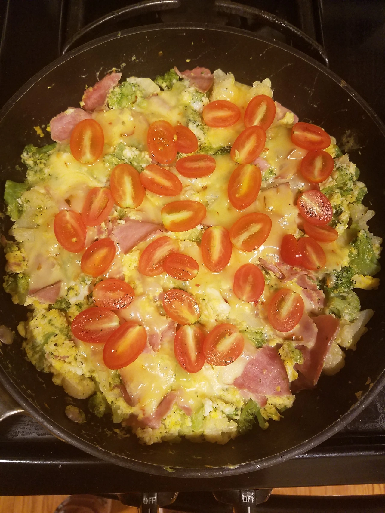 아침에 꼭 계란을 챙겨 먹으라는 부모님의 말씀을 듣고 출근 전 어떻게 하면 계란을 맛있고 쉽게 해 먹을 수 있을까 생각하다가 찾은 레시피. 냉장고에 있는 야채들을 잘게 썰은 뒤 올리브 오일을 적당히 뿌린 프라이팬에 넣고 골고루 익힌다. 야채가 어느 정도 익었으면 계란을 그릇에 풀어 소금, 후추, 페퍼론치네, 그리고 기호에 따라 설탕으로 간을 한 뒤 야채 위에 골고루 붓는다. 이때 야채는 이미 다 익었기 때문에 계란이 완전히 익도록 스크램블을 만들 때처럼 볶아준다. 취향에 따라 햄이나 치즈도 넣어주면 맛있다. 어느 정도 계란이 골고루 익었으면 불을 끄고 완전히 식힌 다음 먹기 좋은 크기로 잘라서 용기에 넣은 뒤 냉장 보관한다. 3-4일 내로 먹는 것이 좋으며 아침에 먹기 직전에 전자레인지에 1분 정도 데워주면 맛있게 즐길 수 있다.