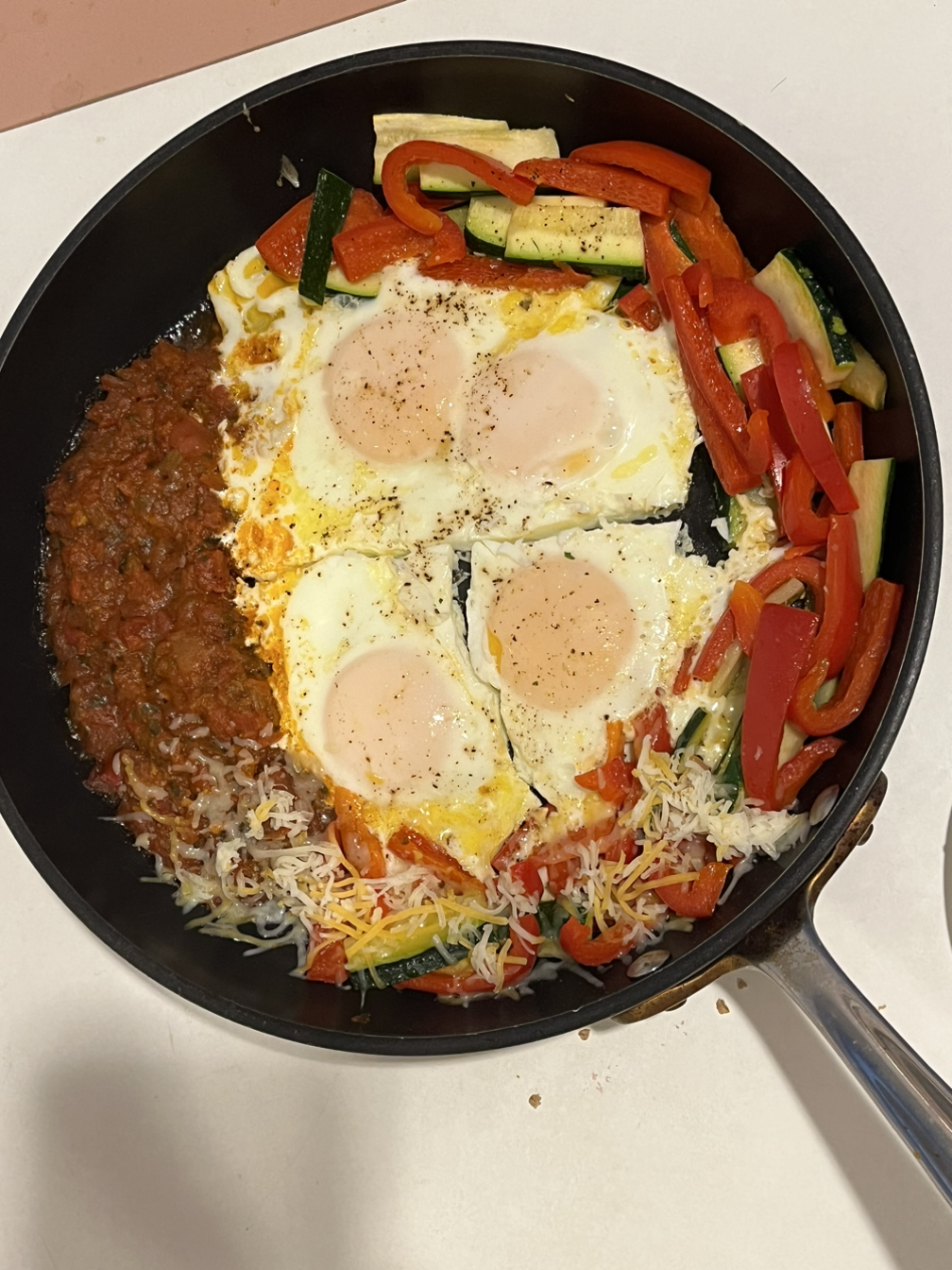 여유롭게 음악을 들으며 아침을 준비하기 시작했습니다. 예전에 먹어본 뒤 맛있어서 집에서 간단히 만들어 먹게 된 샥슈카는 참 매력적인 음식입니다. 언제나 먹어도 먹을 때마다 큰 즐거움을 선사해 줍니다. 샥슈카를 만들려면 일단 팬을 달군 뒤 한쪽에는 올리브 오일을 두른 뒤 좋아하는 야채들을 볶아줍니다. 저는 주로 피망과 호박, 그리고 양배추를 씁니다. 그리고 팬의 다른 한쪽에는 토마토 페이스트를 올려줍니다. 저는 개인적으로 fire roasted 토마토 페이스트가 풍미가 좋아 씁니다. 야채가 어느 정도 익고 토마토 페이스트의 수분도 살짝 날아간 듯 보이면 팬의 중간에 버터를 한 조각 올리고 계란을 넣어줍니다. 간단히 소금과 후추로 간을 하고 뚜껑을 덮은 뒤 계란이 익기를 조금 기다려주면 어느새 맛있는 냄새가 부엌을 가득 채웁니다.