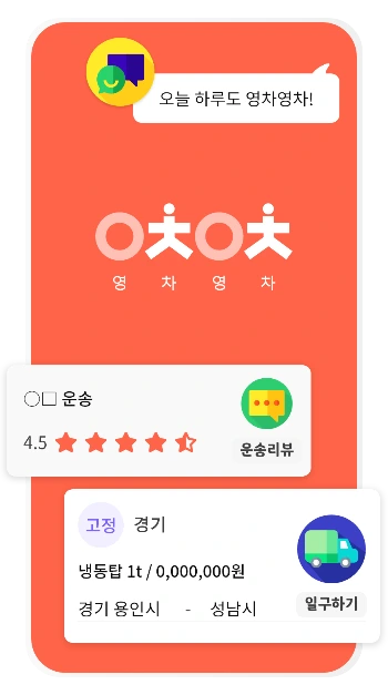 영차영차는 화물주선 플랫폼으로, 기사용 APP과 운송사용 WEB을 통해 차주와 운송사를 연결하는 중개서비스를 제공합니다. '영차'는 영업용 화물차주의 준말로 이 공간에서 함께 힘을 합해 여러 정보들을 나누며 더 나은 운송이 되었으면 하는 마음을 담았습니다.