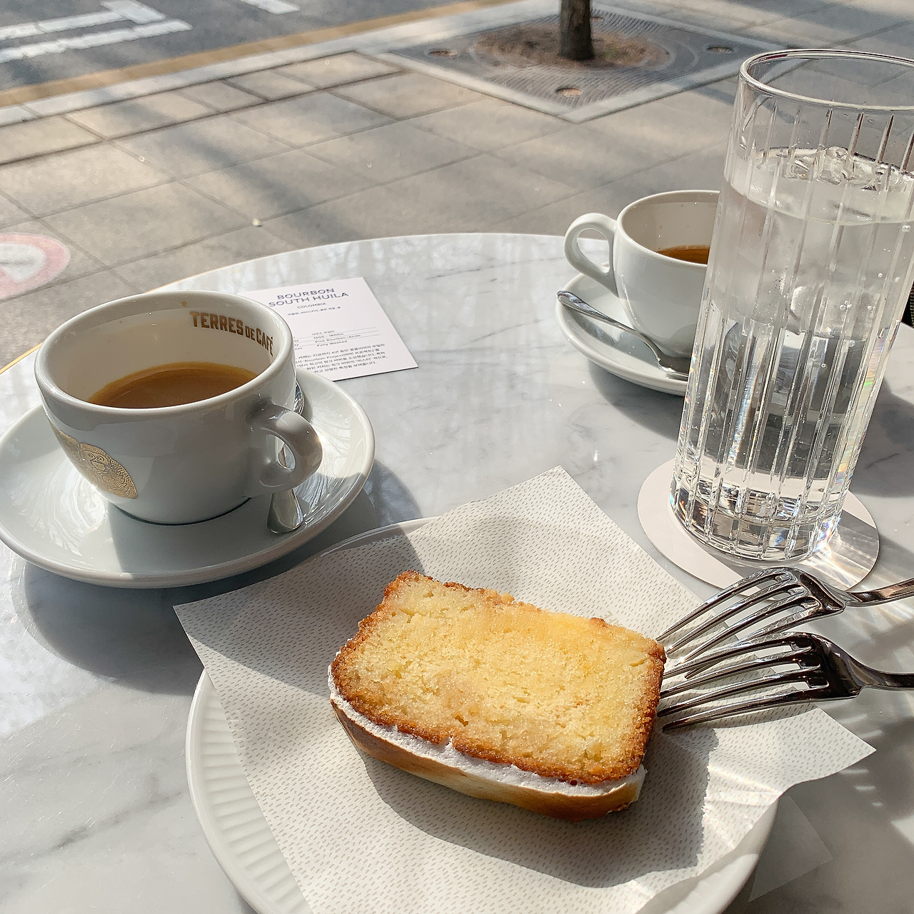 난 1년에 한 번 돌아오는 이 축제나 다름없는 첫 봄을 만끽해야 했다. 열두 달 중 고작 한두 달 지속되는 이 짧은 행복을 최대한 즐기기 위해 난 최선을 다했다. (사실 이렇게 몇 주 만에 글쓰기를 하는 이유도 이 때문이다.) 주말 동안 할 일이 잔뜩 쌓여있는 남편을 아침부터 꼬드겨서 늘 가보고 싶었던 노천카페를 가는 것으로 첫 봄을 축하했다. 반드시 노천에 앉아야 하는 의무감이 느껴지는 이 축복받은 계절은 눈 깜짝할 새 지나가기 때문에 이 기회를 절대로 놓쳐선 안 된다. 늘 책을 읽어야 했던 학창 시절, 난 지루한 책을 의무감에 쫓겨 지지부진하게나마 읽어야 할 때, 사소한 행복감을 느끼기 위해 공원에서, 잔디밭에서, 벤치에서 자리를 잡곤 했다. 그때 버릇이 아직도 남아있는 것일까. 아니면 억지로 만들어낸 그 행복감이 아직까지 뇌리에 박혀 있을 정도로 벅찼던 것일까. 뭐가 됐든 난 여전히 노천에서 평온한 시간을 보내는 게 DNA에라도 박혀있는 것처럼 꼭 해야만 하는 의무로 느끼고 있다. 남편이 옆에 있는 지금은 예전처럼 책을 읽거나 글을 쓰는 혼자만의 시간을 만끽할 수는 없지만, 누군가가 옆에서 나와 같은 행복을 느끼고 있다는 또 다른 기쁨이 대신 자리 잡고 있다. 그리고 이 기쁨은 의외로 너무 맛이 없는 커피도 망가뜨릴 수 없었다. 이는 맛없는 커피보단 레몬향이 가득한 파운드케이크에 집중하며 노천을 즐기고, 좋아하는 베이커리에서 까눌레를 포장하는 것으로 일부러 더 봄 분위기에 한껏 취해보려 노력한 덕분일 것이다. 그리고 여기에 남편이 혼신의 힘을 다해 찍어준 인생샷은 이 외출을 더욱 완벽하게 만들어 주었다.