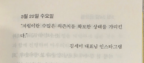 109페이지. 김세미 대표가 인스타그램에 남긴 말을 김보희 대표가 옮겨 적은 문장이었다.