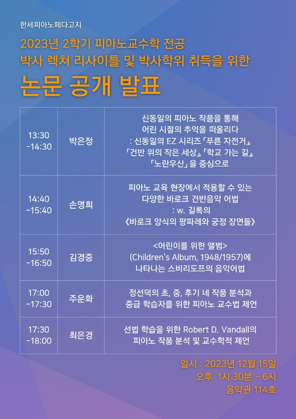 한세대학교 피아노 페다고지 박사 과정에 있는 박은정 선생님이 박사 논문 주제로 “신동일의 피아노 음악”을 정했다고 한다. 논문 작성에 들어가기 전에 자신의 연주와 함께 발표회를 가졌는데, 전달력이 뛰어난 강의였고 조사를 많이 한 발표였다. 내게도 의미 있는 일이다. 논문이 기대된다.