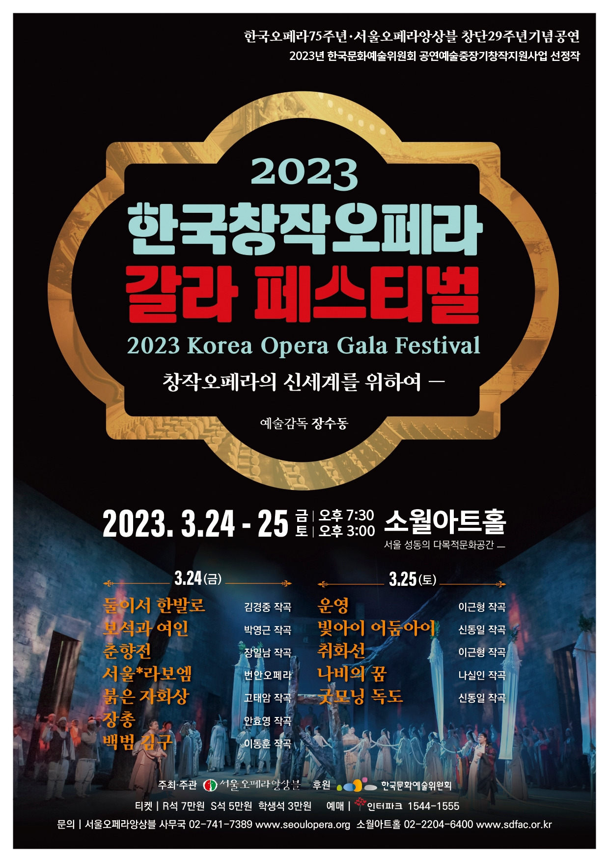 서울오페라앙상블이 그동안 발표한 창작오페라의 주요 장면을 발췌하여 2일 동안 <창작오페라 갈라콘서트>를 개최했다. 내 작품은 25일에 2편이 포함되었는데, 가족환경오페라 <빛아이 어둠아이>와, 온전한 오페라는 아니지만 <굿모닝 독도>도 발췌하여 함께 공연했다. <굿모인 독도>의 마지막 곡 <독도아리랑>이 갈라콘서트의 피날레를 장식했는데, 전 출연진의 합창으로 화려하게 공연을 마쳤다. 대표이신 장수동 선생님의 창작오페라에 대한 열정이 놀랍고 감사하다.