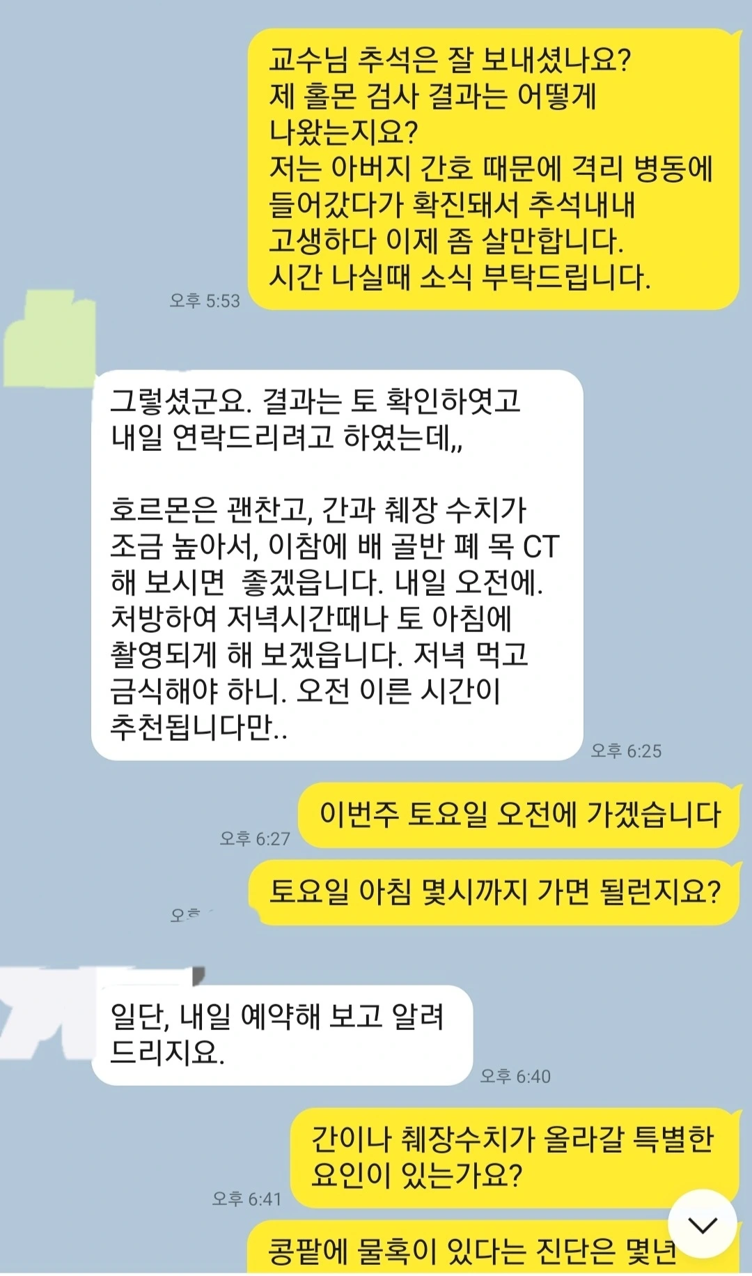 직장 생활로 바쁜 나를 위해 직접 검사 예약도 해주고 친절하게 톡을 보내 설명까지 해주는 의사 선생님이 있어서 나는 너무 행복하다.