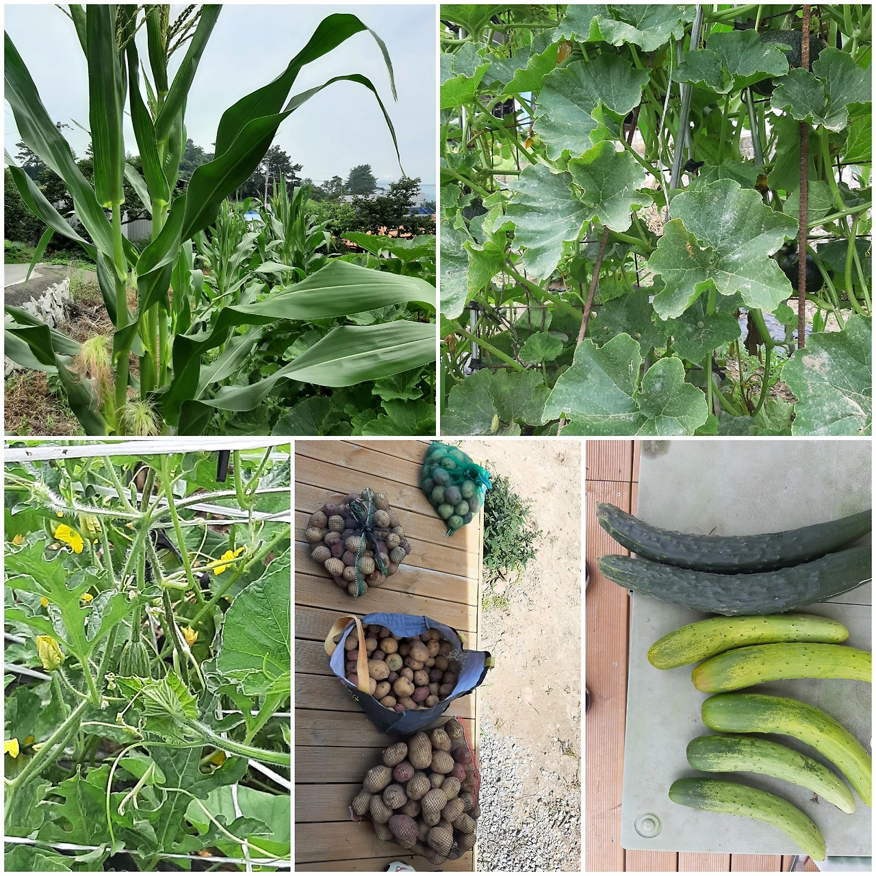 내 키보다 한참 더 큰 옥수숫대에는 드디어 옥수수 개꼬리(수꽃)와 옥수수수염이 보이고 작은 옥수수가 달려 잘 영글어 가고 있다. 단호박은 작년에 이어 올해도 좋은 결과를 보여 줄 것 같다. 벌써 핸드볼 공만 한 단호박이 몇 개나 달려 있었다. 자꾸 따서 쪄먹고 싶은 충동을 억누를 수 없어 어머니께 따면 안 되냐고 여쭤보니 아직 더 익어야 된다고 하셨다.