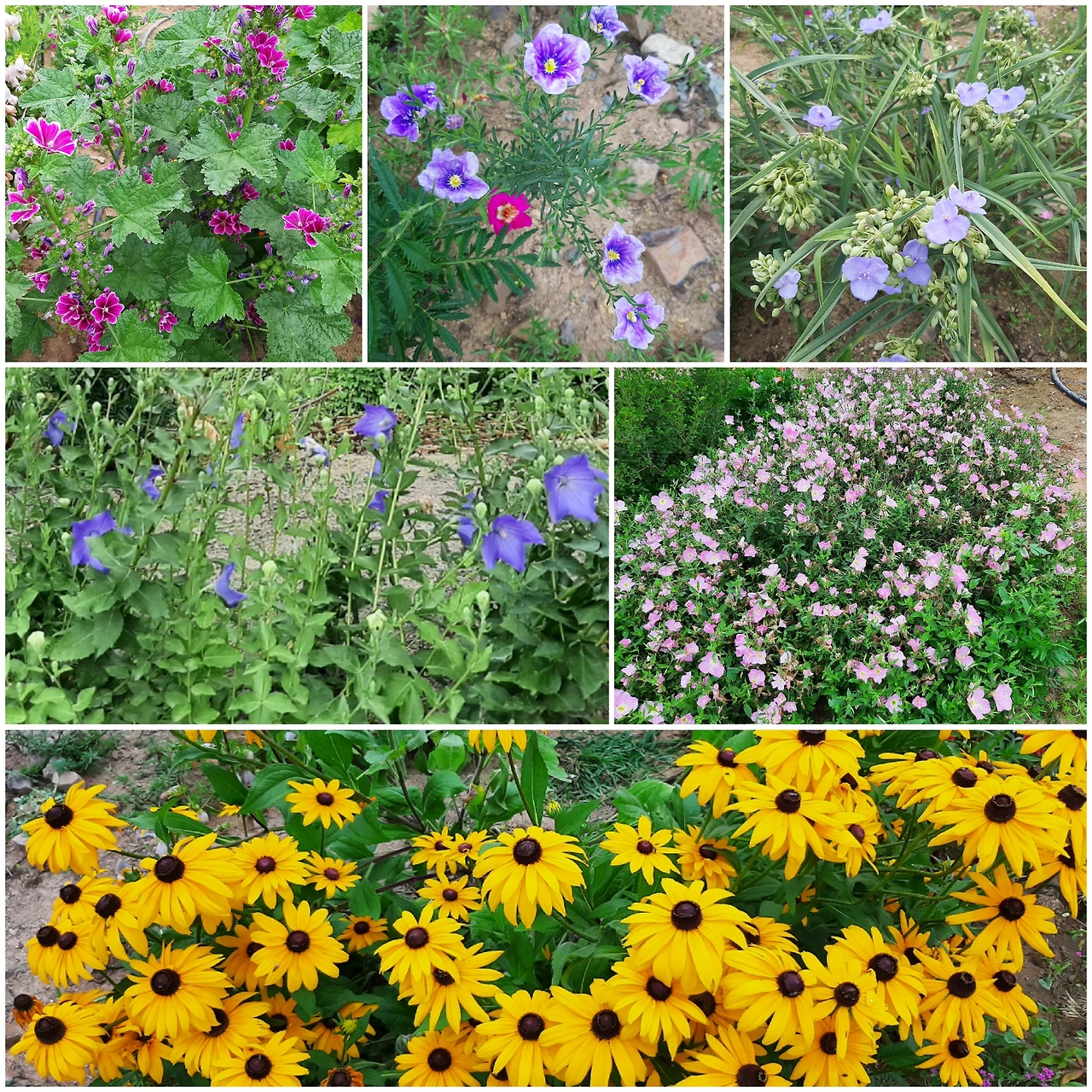 당아욱, 팬지, 봉선화, 자주달개비, 다람쥐꼬리 세덤, 채송화, 초롱꽃, 도라지꽃, 낮달맞이, 루드베키아가 서로서로 나 좀 봐달라는 듯 뽐내고 있다.