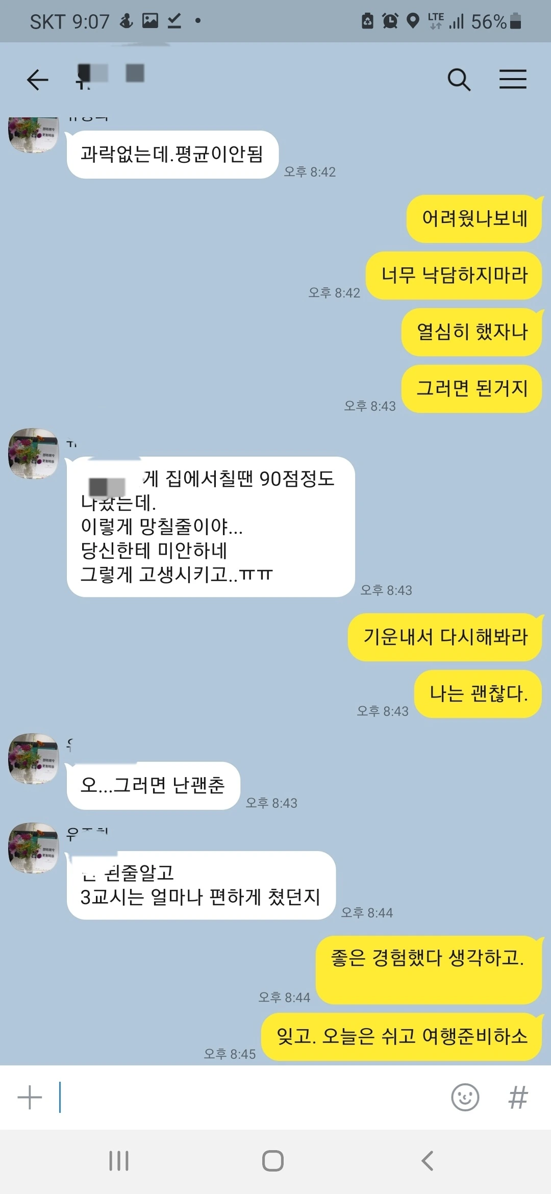어제까지만 해도 최종평가 시험에서 좋은 점수를 받았다며 내일 시험에도 이렇게만 나왔으면 좋겠다고 들뜬 목소리로 자신감을 드러냈다. 그리고 늦은 오후 시간 담담한 목소리로 시험을 끝냈다는 전화 통화를 했다.