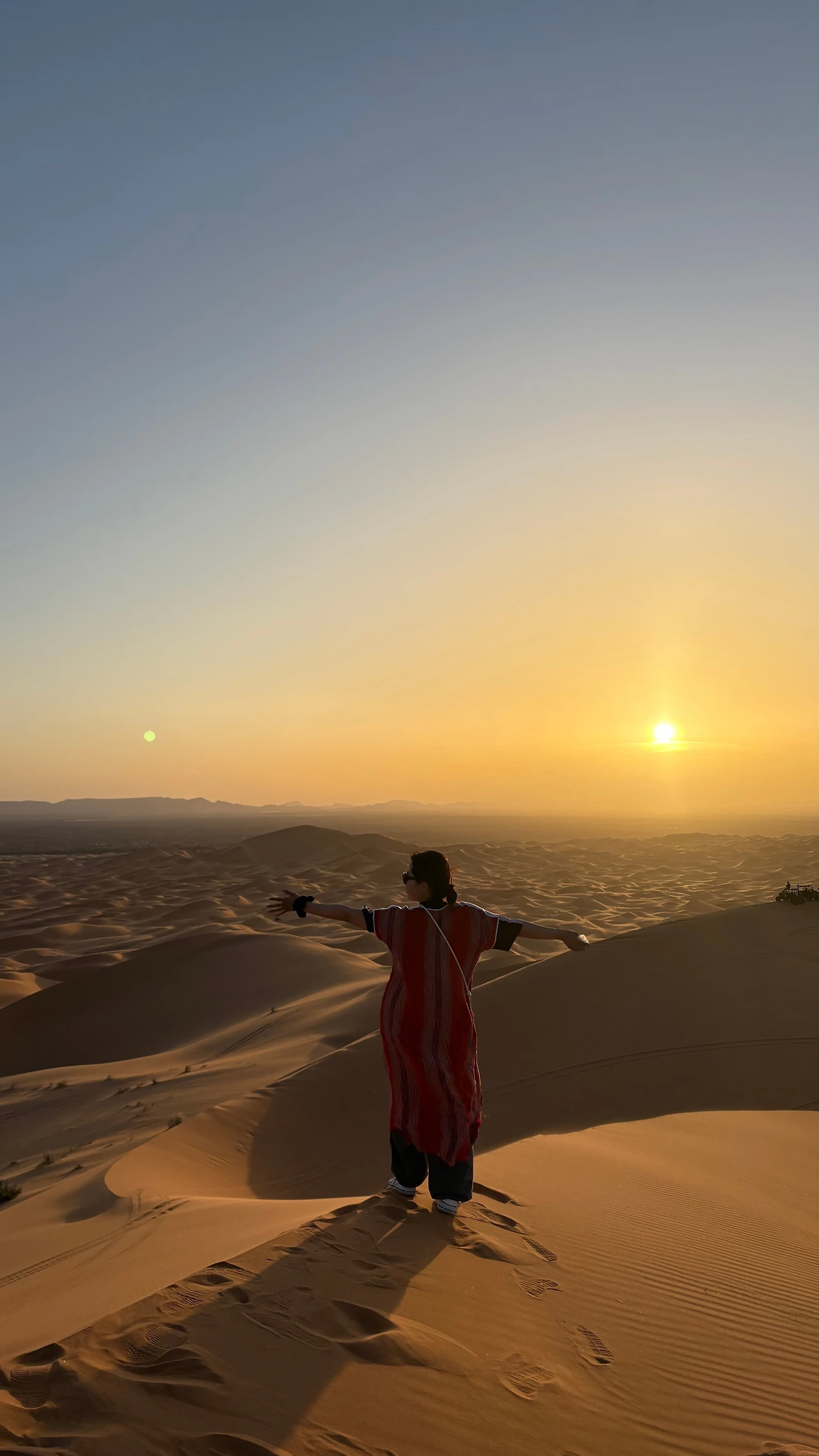 그녀가 보내온 사하라 사막 한가운데에서의 일몰을 배경으로 한 인생샷은 정말 환상적이었다.